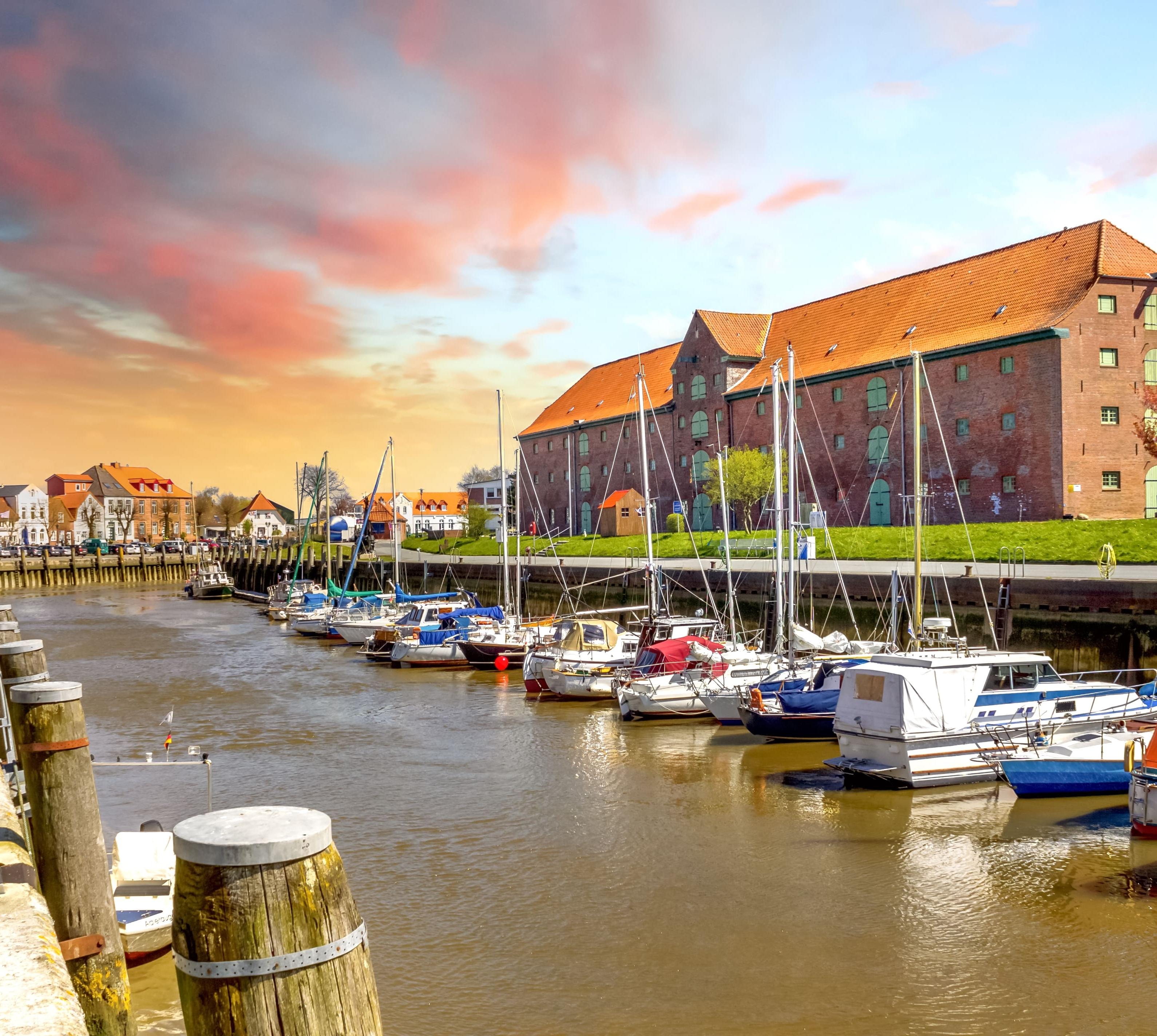 Willst du das alte Tönning entdecken, dann fahr zum Hafen – er ist der schönste an der Nordseeküste: Auch heute noch zeugen die gut erhaltenen Gebäude auf dem Hafendeich – Wohnhäuser, Restaurants – von einstiger wirtschaftlicher Blüte.