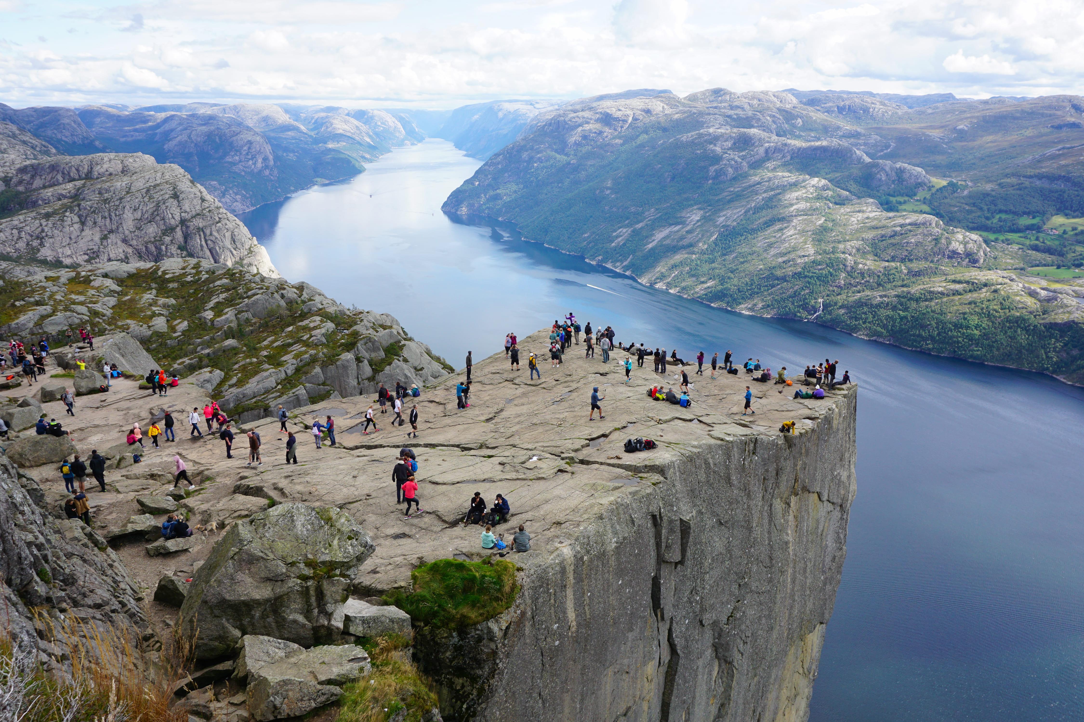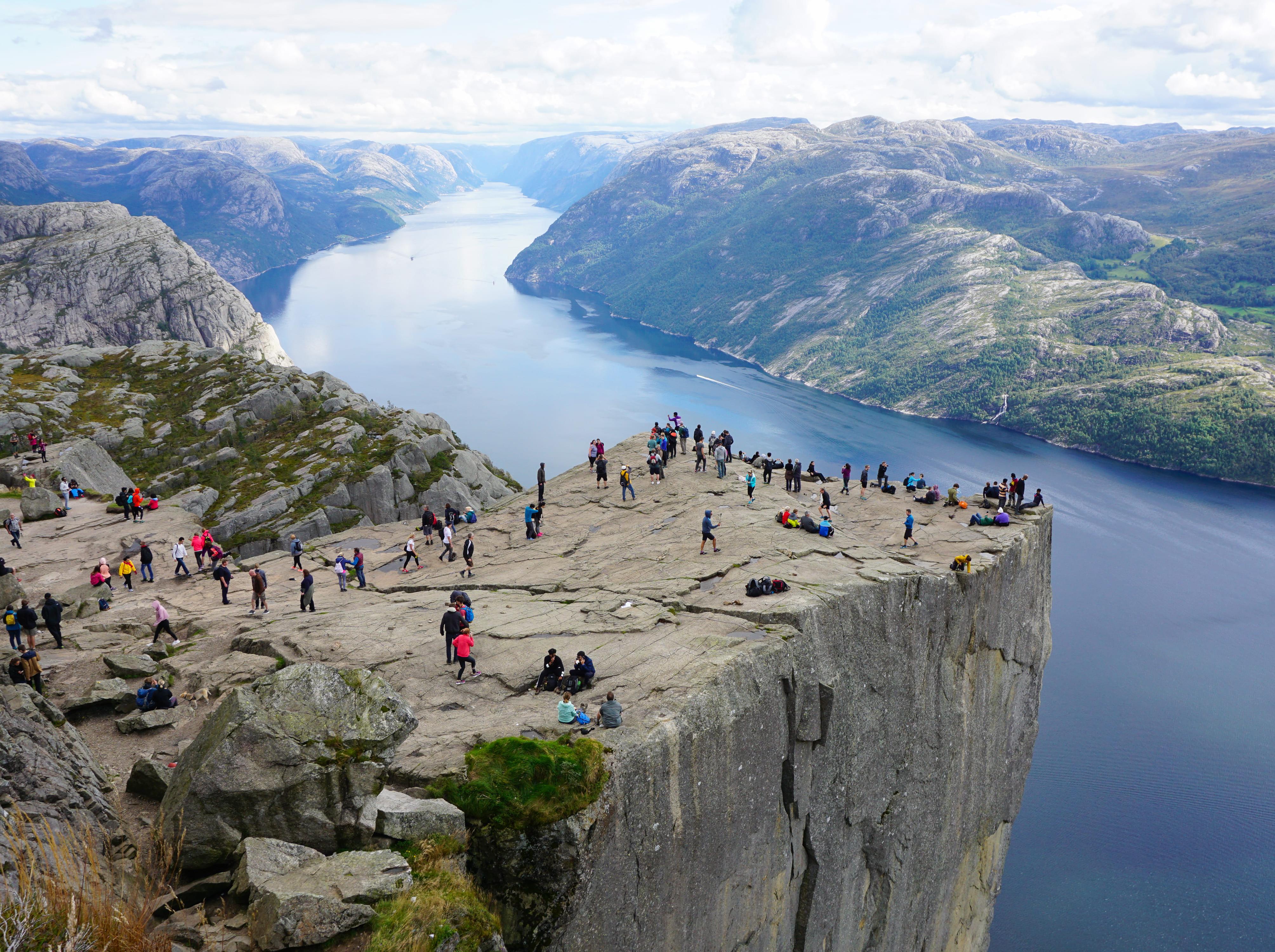 Obwohl es keinerlei Geländer oder Absperrung am Preikestolen gibt, gab es dort bislang keinen einzigen Unfall zu beklagen. Das liegt wohl auch daran, dass die meisten Touristen angesichts des imposanten Abgrunds besondere Vorsicht walten lassen - immerhin geht es die 600 Meter fast senkrecht in die Tiefe. Viele Besucher kriechen daher die letzten Meter auf dem Bauch zur Felskante, denn auch im Liegen bleibt bei diesem Anblick der Adrenalinkick nicht aus.