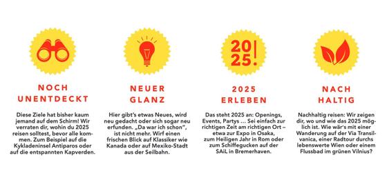 Wo soll es 2025 hingehen? Zieht es dich eher in die Natur, oder möchtest du mal wieder Stadtluft schnuppern? Willst du das eigene Land erkunden, oder musst du raus – nach Europa oder in die Welt? Egal, es gibt von allem und für jede:n etwas.