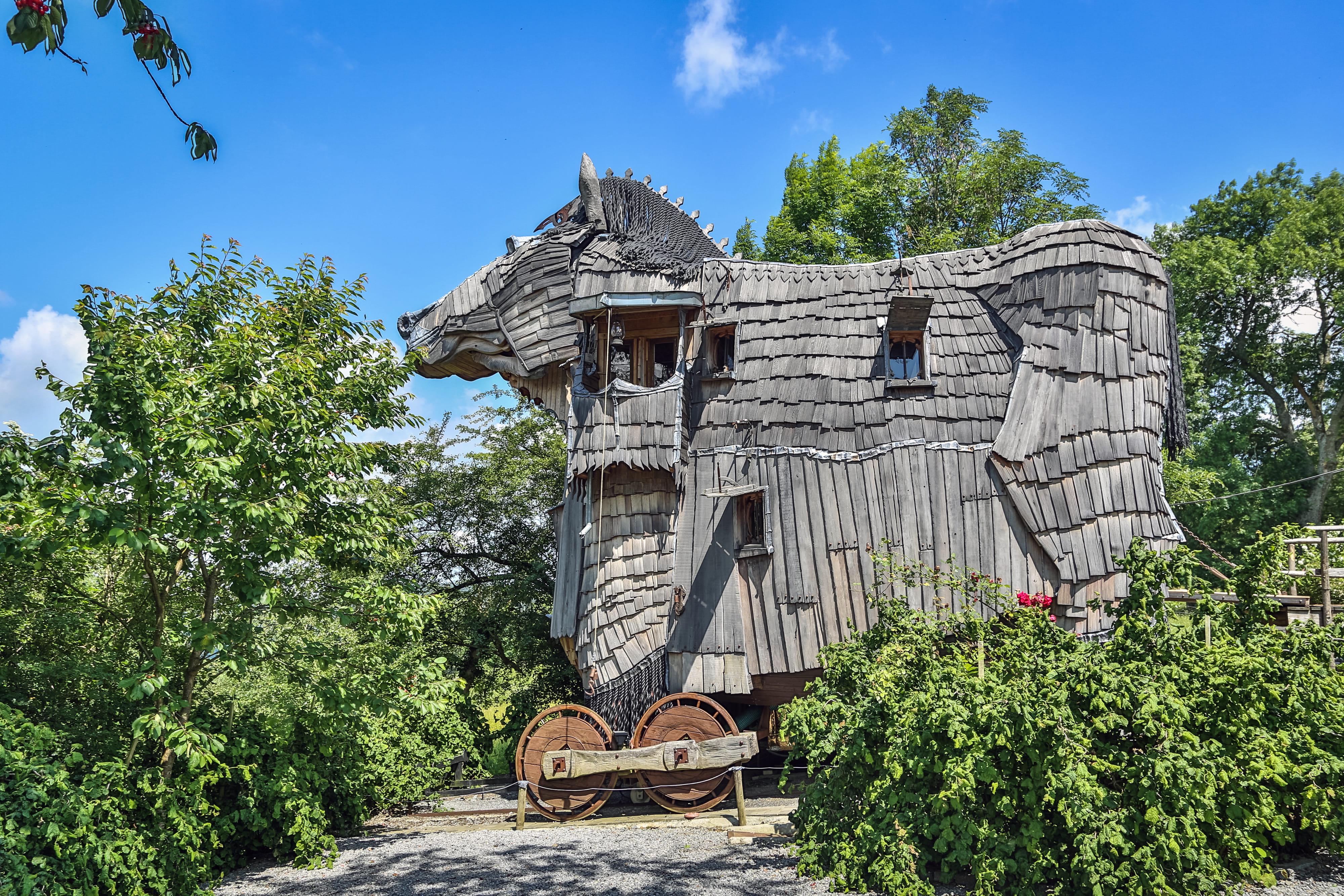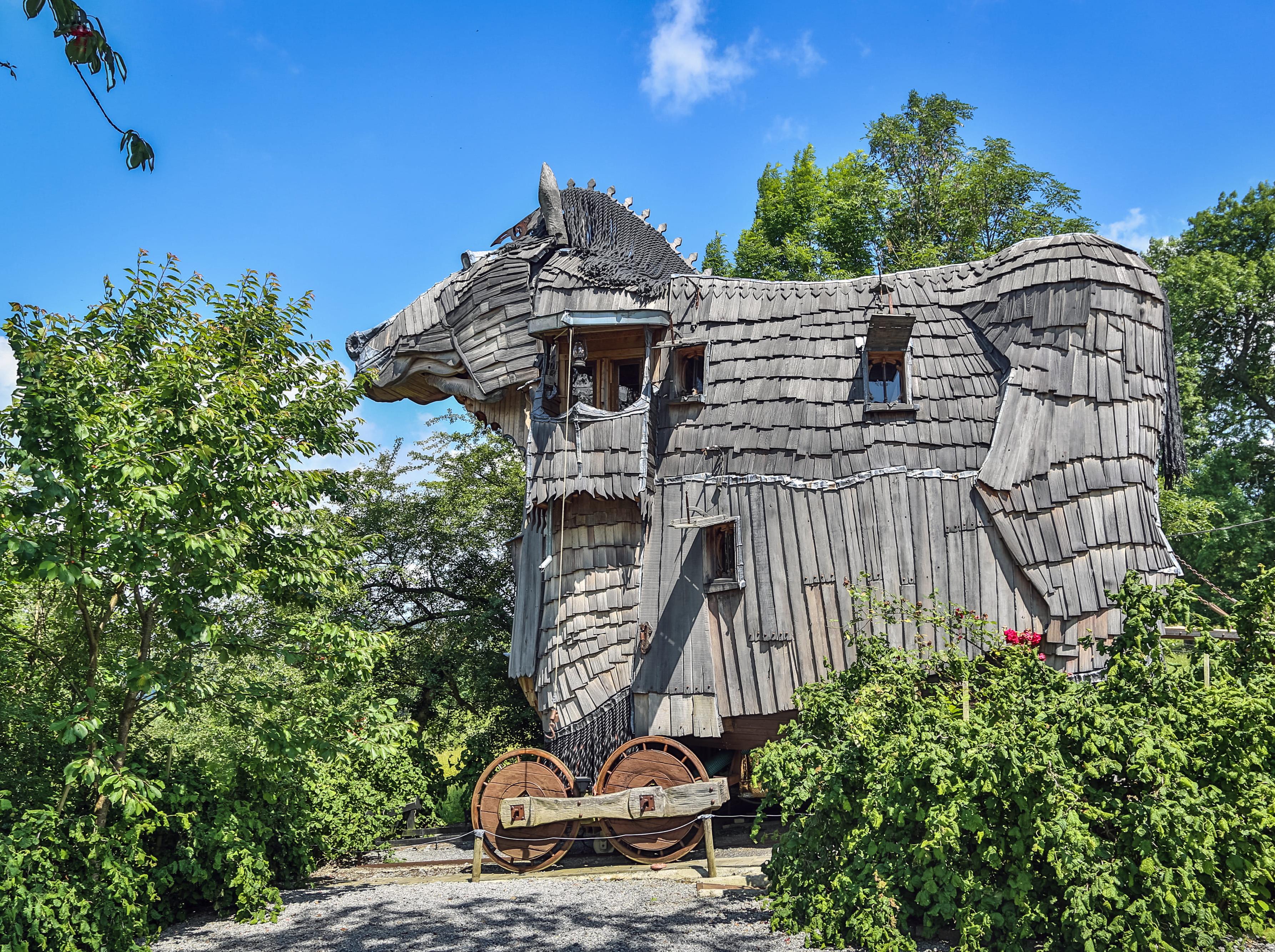 Der griechischen Mythologie zufolge versteckten sich in seinem Bauch Soldaten. Doch das Trojanische Pferd, das der Belgier Dominique Noel errichten ließ, beherbergt dieser Tage ausschließlich Übernachtungsgäste. Im sagenhaften Hotel La Balade Des Gnomes können Besucher in fantastische Welten abtauchen – und sich sogar mit einer Meerjungfrau betten.