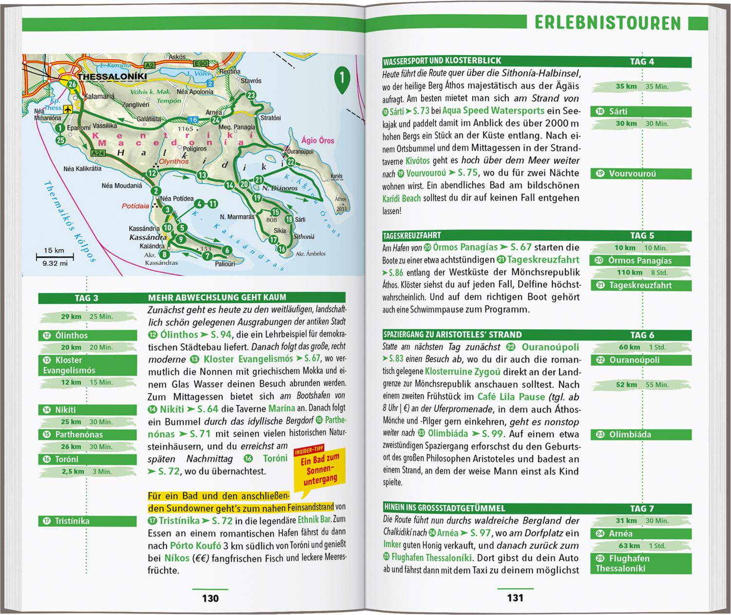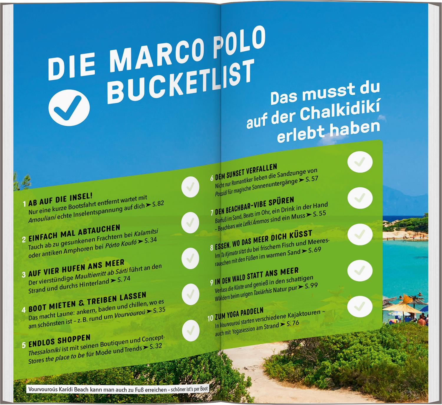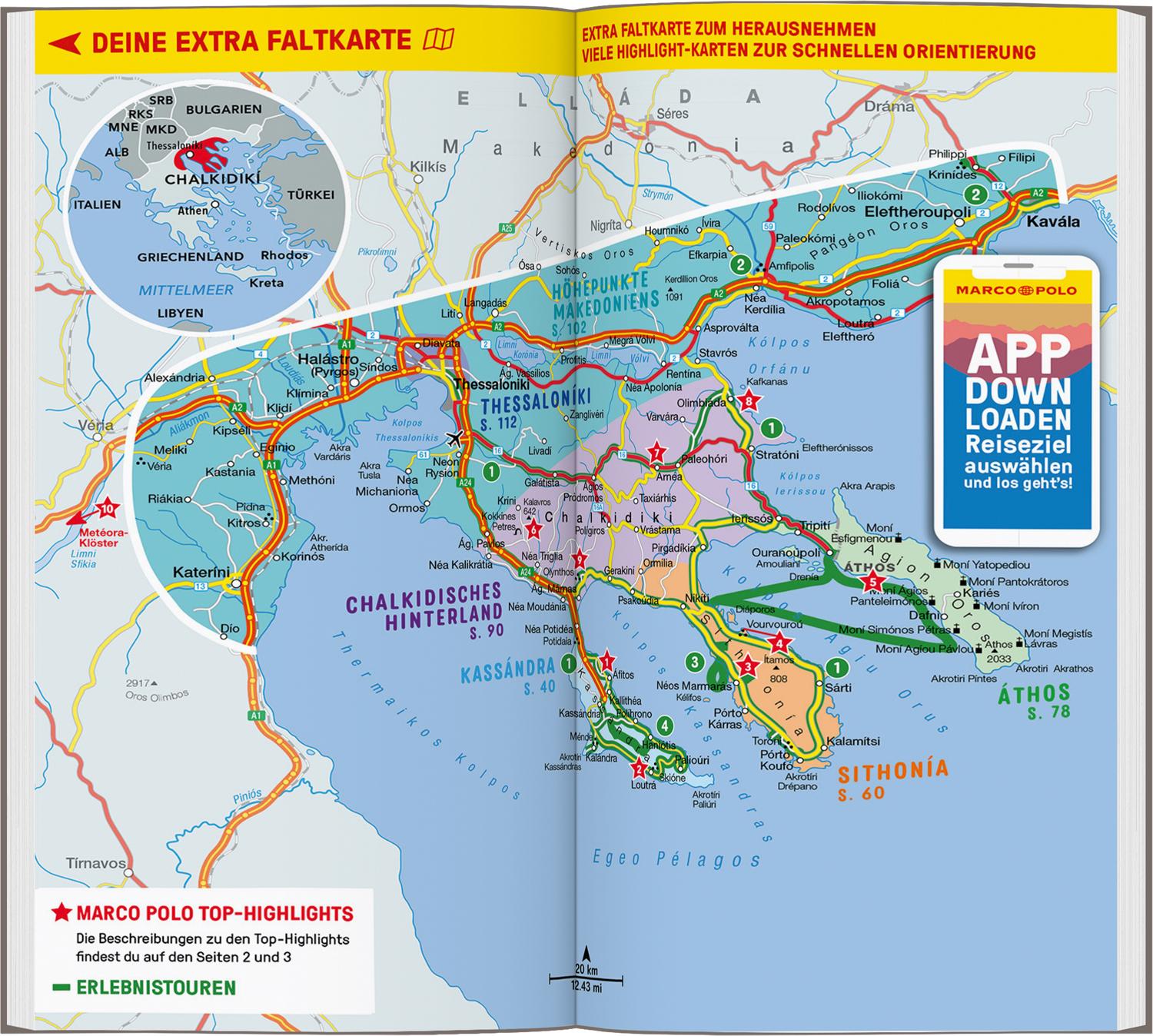 Grün und Blau siehst du in der Chalkidikí überall, egal ob du vor der Küste Kassándras Wracktauchen gehst, durch die Kiefernwälder Sithonías streifst oder vom Schiff aus einen Blick auf die Mönchsklöster von Áthos wirfst. Das ist dir nicht genug Farbenspiel? Dann stöbere auf den bunten Märkten von Thessaloníki und mache in stylischen Beachbars die Nacht zum Tag! Ob Strandtag oder Ausflug in die Natur – mit deinem MARCO POLO Reiseführer für die Chalkidikí bist du für alles bestens gerüstet!