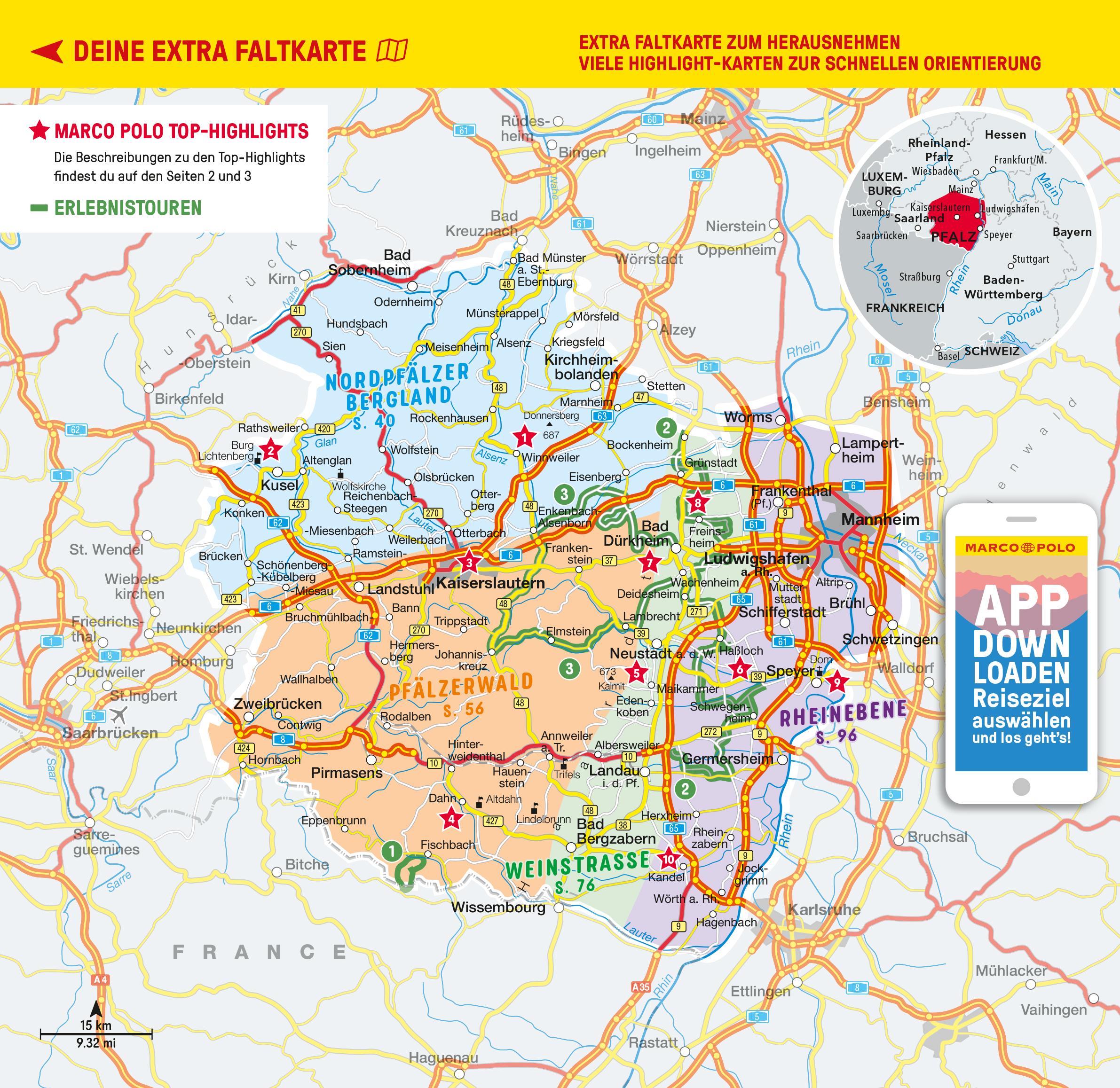 Burgen, Reben und Legenden: Entdecke mit dem MARCO POLO Reiseführer die Pfalz Von Mittelalter- bis Industrieromantik, von Weingenuss bis Waldabenteuer: Der Süden von Rheinland-Pfalz hält viele Highlights bereit! Über die Jahre haben römische, französische und bayerische Einflüsse die Pfalz geprägt.