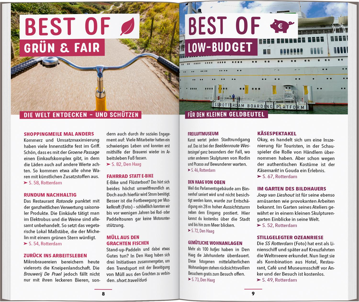 Hier sind die Wege kurz: Die Städte in Süd- und Nordholland mit ihrer avantgardistischen Architektur, weltberühmten Kunstwerken und stilvollen Märkten lassen sich wunderbar nacheinander erkunden. Mit den Insider-Tipps im MARCO POLO Reiseführer verpasst du nichts in der quirligen und visionären Hafenstadt Rotterdam, der charmanten Kunst- und Residenzstadt Den Haag und dem zauberhaften Städtchen Delft dazwischen.