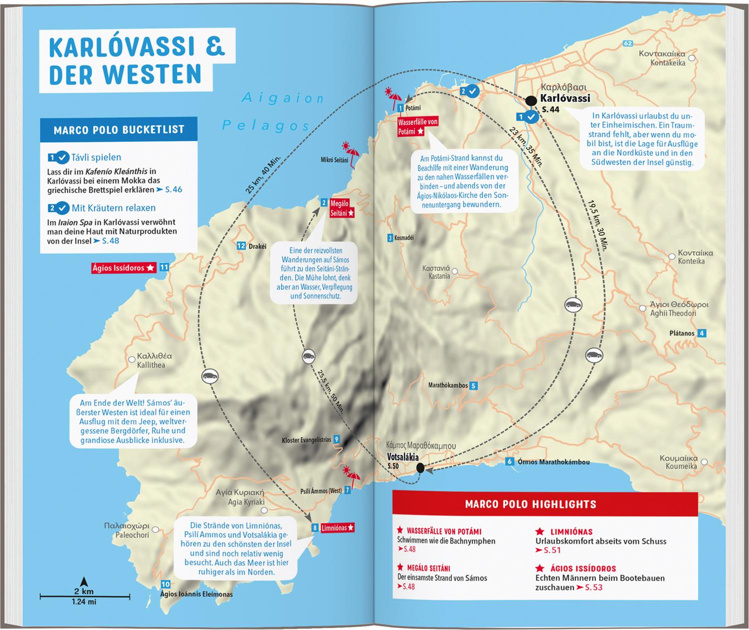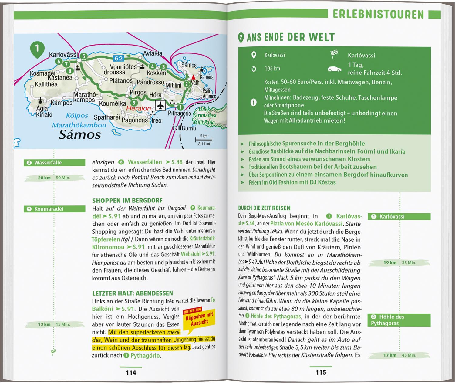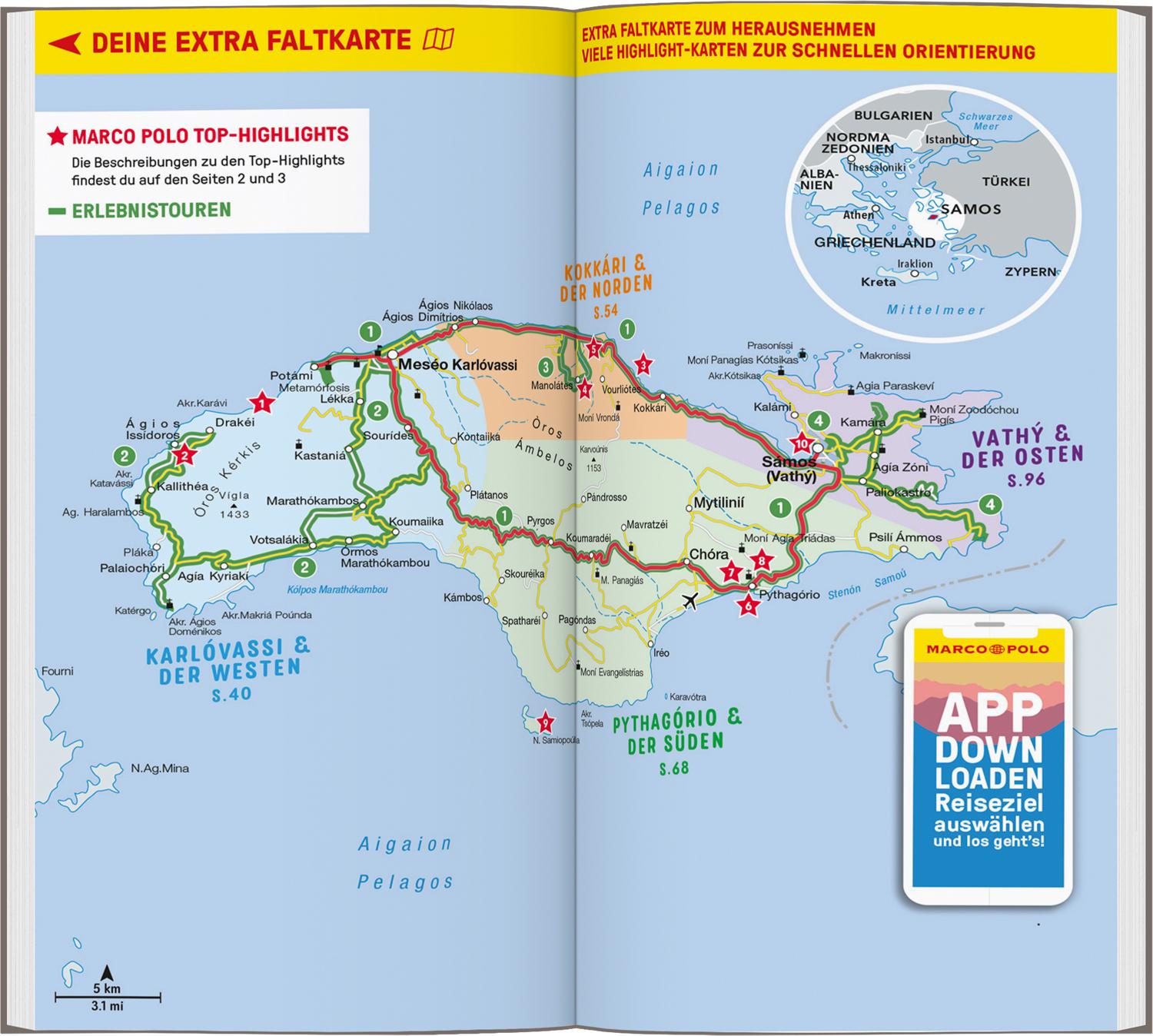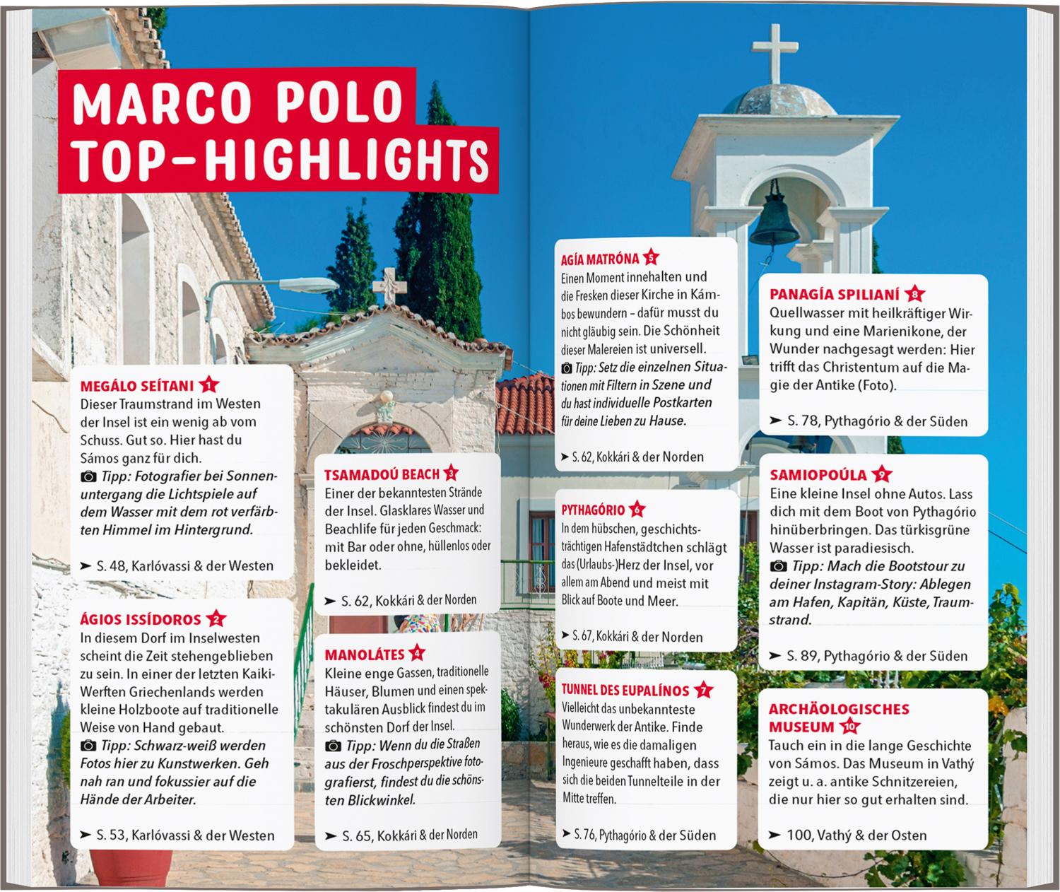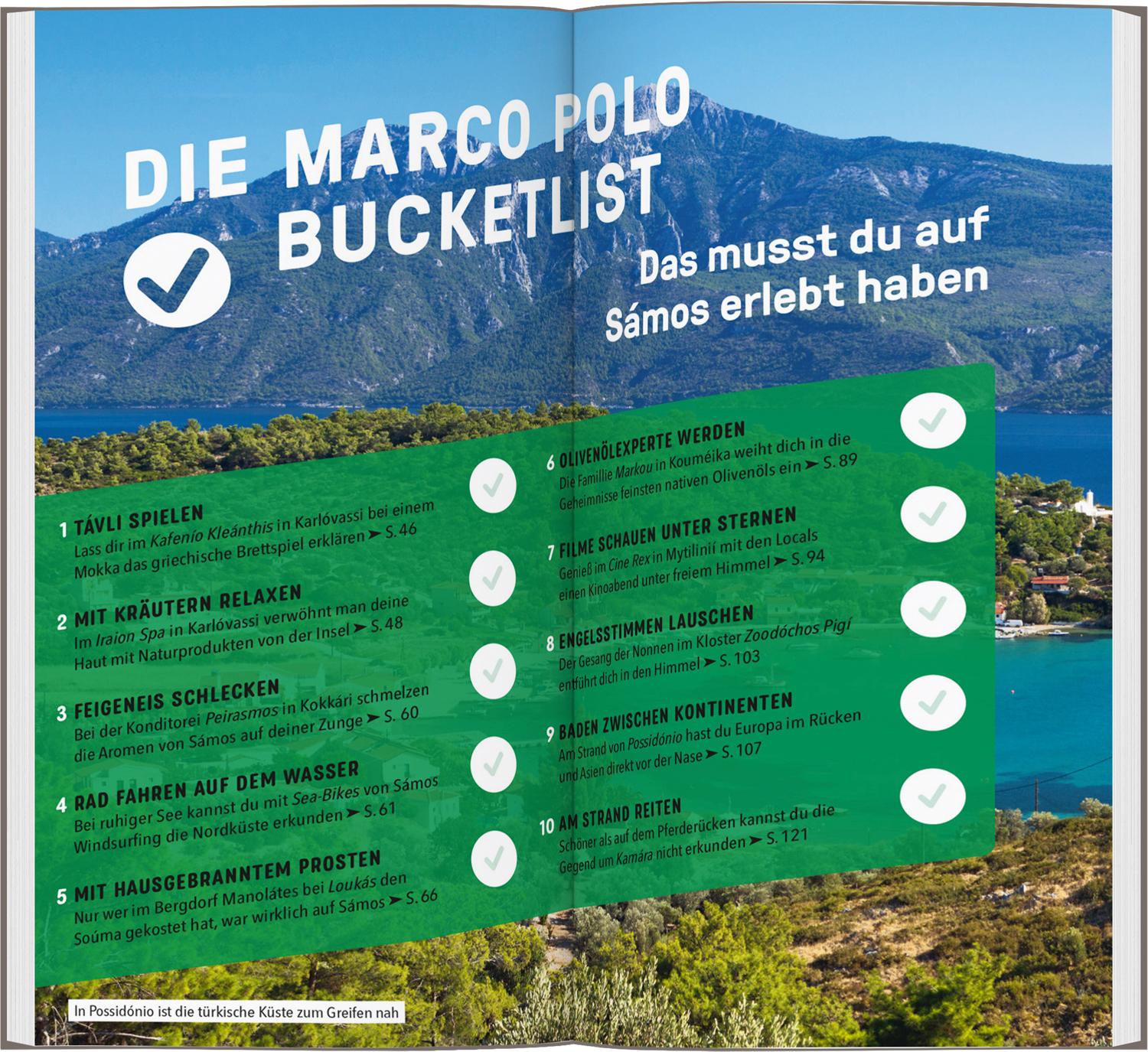 Entspannen zwischen Wald und Meer mit dem MARCO POLO Reiseführer Sámos Auf Sámos erwartet dich ein Urlaub für alle Sinne. Lass dich verführen vom Duft der Pinienwälder, schmecke die salzige Meeresbrise und genieße die Sonne auf der Haut! Deine Augen verwöhnt das Inselpanorama: Weiß leuchtende Häuser schmiegen sich hier ans türkisblaue Meer.