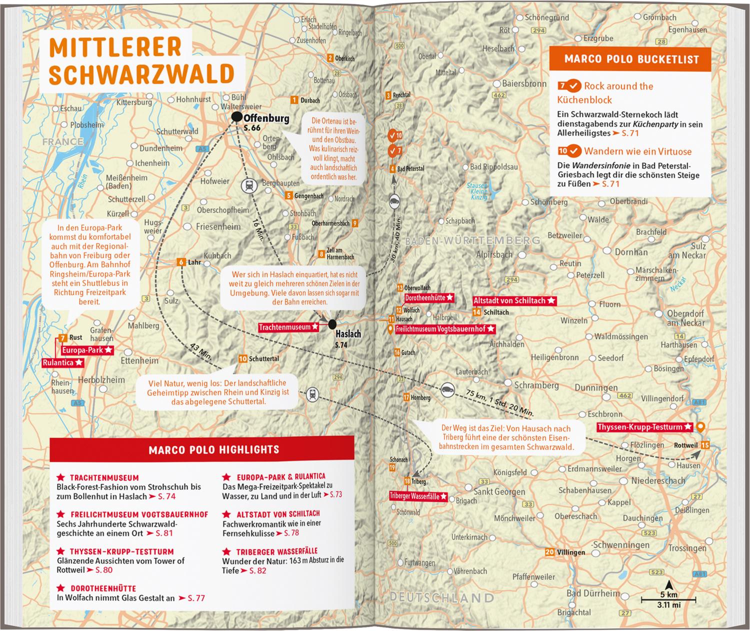 Lass dich im Baden-Badener Friedrichsbad mit einer Seifenbürstenmassage in den Wellnesshimmel beamen, beweise deine Schwindelfreiheit am Klettersteig vom Karlsruher Grat oder genieße großes Gaumenkino in einem der zahlreichen Sterne-Restaurants. Worauf auch immer du Lust hast: Mit den Tipps in deinem MARCO POLO Reiseführer Schwarzwald verpasst du keins der vielen Highlights der Region!