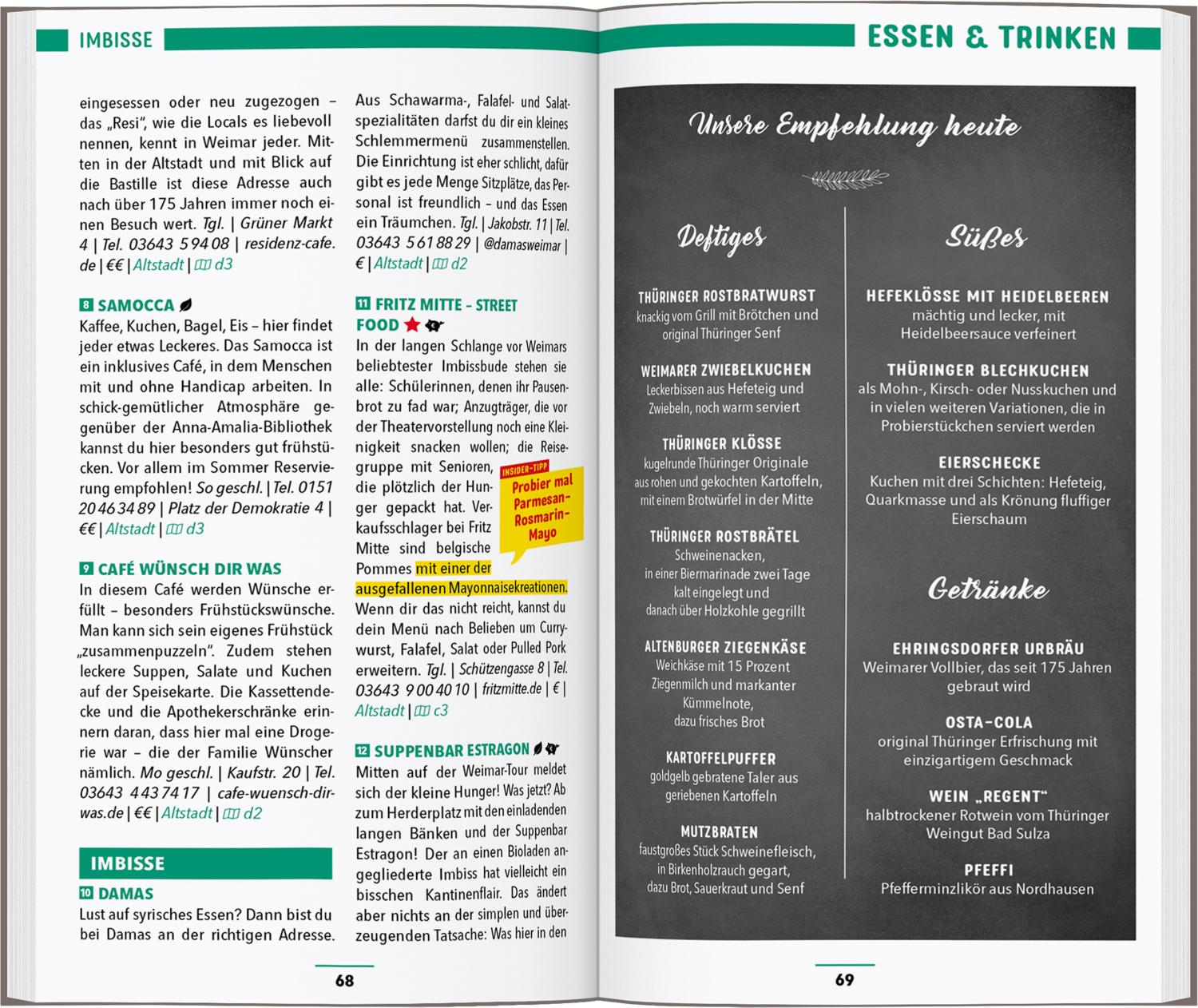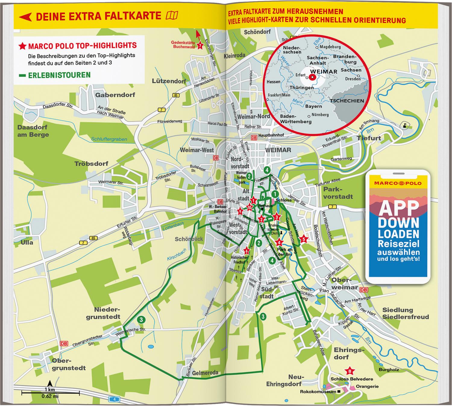 Verschlafenes Städtchen? Von wegen! Goethe und Schiller inmitten von Skatern, historische Fassaden mit modernster Projektionstechnik, Bach im Einklang mit Technosound – in Weimar treffen Gegensätze aufeinander. Ob Barhopping in der Altstadt, Sonnenbaden im historischen Park oder Bratwurst futtern auf dem Wochenmarkt: Mit dem MARCO POLO Reiseführer Weimar wird dein Städteurlaub zum Erlebnis!