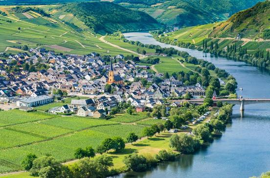 „Einen Hinkelstein braucht man immer im Haus“ - das Zitat von Obelix passt auch nach Trittenheim (1100 Ew.), denn hier gibt’s am Pilgerweg nach Klausen das älteste Zeugnis menschlicher Siedlungen im Moselland - nämlich einen Menhir namens „Eselstratt“, der mit etwa 3500 Jahren noch deutlich älter ist als der Comic-Held. Spuren weisen darauf hin, dass der Stein mit Werkzeugen bearbeitet wurde und einem Fruchtbarkeitskult diente. Außerdem steht bei Trittenheim das einzige erhaltene Fährturmpärchen zwischen Perl und Koblenz. Die gegenüberliegenden Türme aus dem 19.Jh. dienten zur Verankerung des Zugseils für die Pontonfähre. Keine ganzen Wildschweine, aber erlesenes, mehrfach ausgezeichnetes Essen findest du im Wein- und Tafelhaus.