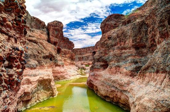 Direkt hinter dem Parkeingang zum Sossusvlei führt eine Schotterstraße zu dem 4,5 km südlich gelegenen Sesriem Canyon. Bis zu 30 m tief hat er sich in die Erdoberfläche eingegraben. Über einen steilen Abstieg gelangst du in die Unterwelt, wo kleine Kolke, Wasserpools in einem ausgetrockneten Flussbett, zum Schwimmen einladen.
