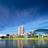 Friedlicher Park mit Seen und einem wunderschönen Glashaus mit tropischem Regenwald.