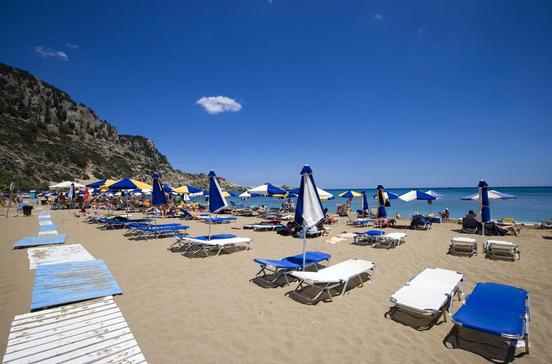 Der Kiesstrand Afántou Beach ist zwar kilometerlang, landschaftlich aber eher unattraktiv und außerdem völlig schattenlos. Ein Minizug auf Rädern fährt tagsüber einmal in der Stunde vom Dorf zum Strand.