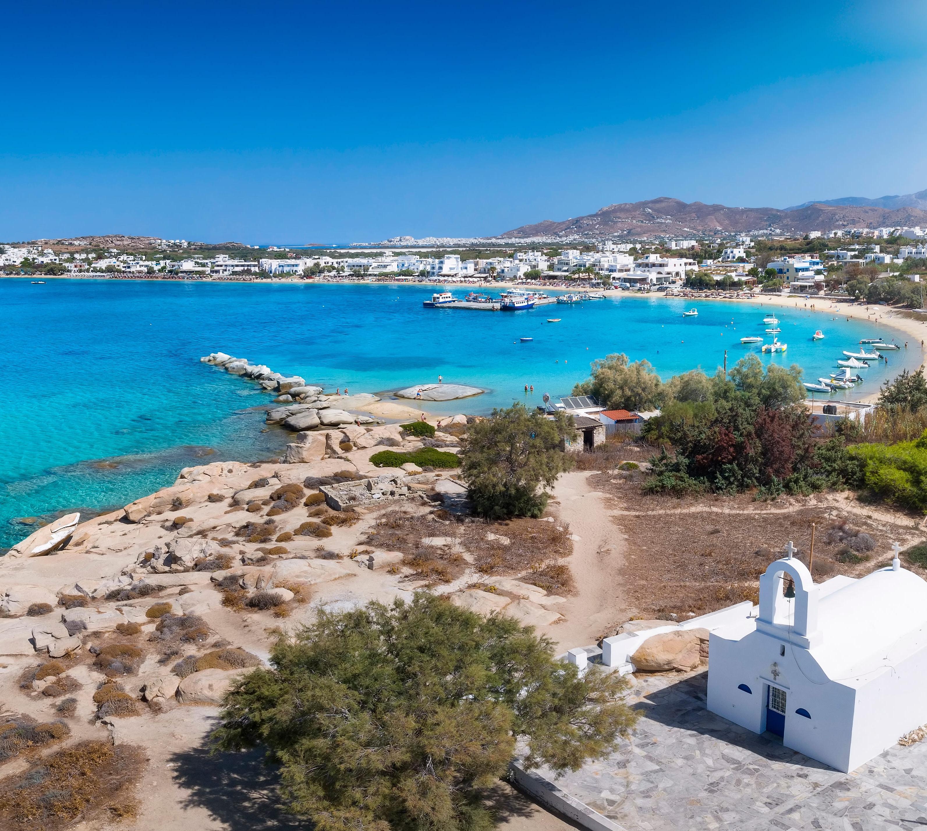 Die Hauptstadt der gleichnamigen Insel ist äußerst geschäftig. Entlang der Uferfront konzentrieren sich Cafés, Restaurants und Geschäfte. An den sich südlich anschließenden Stränden ist ein ausgedehntes Hotelviertel entstanden. Wie ein Hort der Stille mutet inmitten der modernen Häuser die Altstadt an, die sich die Hänge eines rund 50 m hohen Hügels am Hafen emporzieht, dessen oberer Teil seit 1207 durch eine mächtige Burgmauer geschützt war. Enge, zum Teil überbaute Gassen führen an Häusern vorbei, die Wappen fränkischer Adelsfamilien tragen. Auf dem kleinen Gipfelplateau des Kástro-Viertels erheben sich die römisch-katholische Kathedrale aus dem 17.Jh. und die ehemalige Residenz des katholischen Bischofs. Am nördlichen Rand der Altstadt steht nahe der Hauptstraße nach Engarés die orthodoxe Kathedrale der Insel. Hier befindet sich ein Museum, in das Ausgrabungen einer mykenischen Siedlung aus dem 14.-11.Jh. v.Chr. und Familiengräber aus geometrischer Zeit (900-700 v.Chr.) integriert sind. Eine kleine Felsinsel im Norden des Hafenbeckens, über einen kurzen Damm mit der Stadt verbunden, trägt ein weithin sichtbares monumentales Marmortor, "portára" genannt. Es ist der Überrest eines um 530 v.Chr. begonnenen monumentalen Tempels, der jedoch nie vollendet wurde, und heute der idealer Standort ist, um den Sonnenuntergang zu erleben. Unterhalb des Damms kann auch gebadet werden.