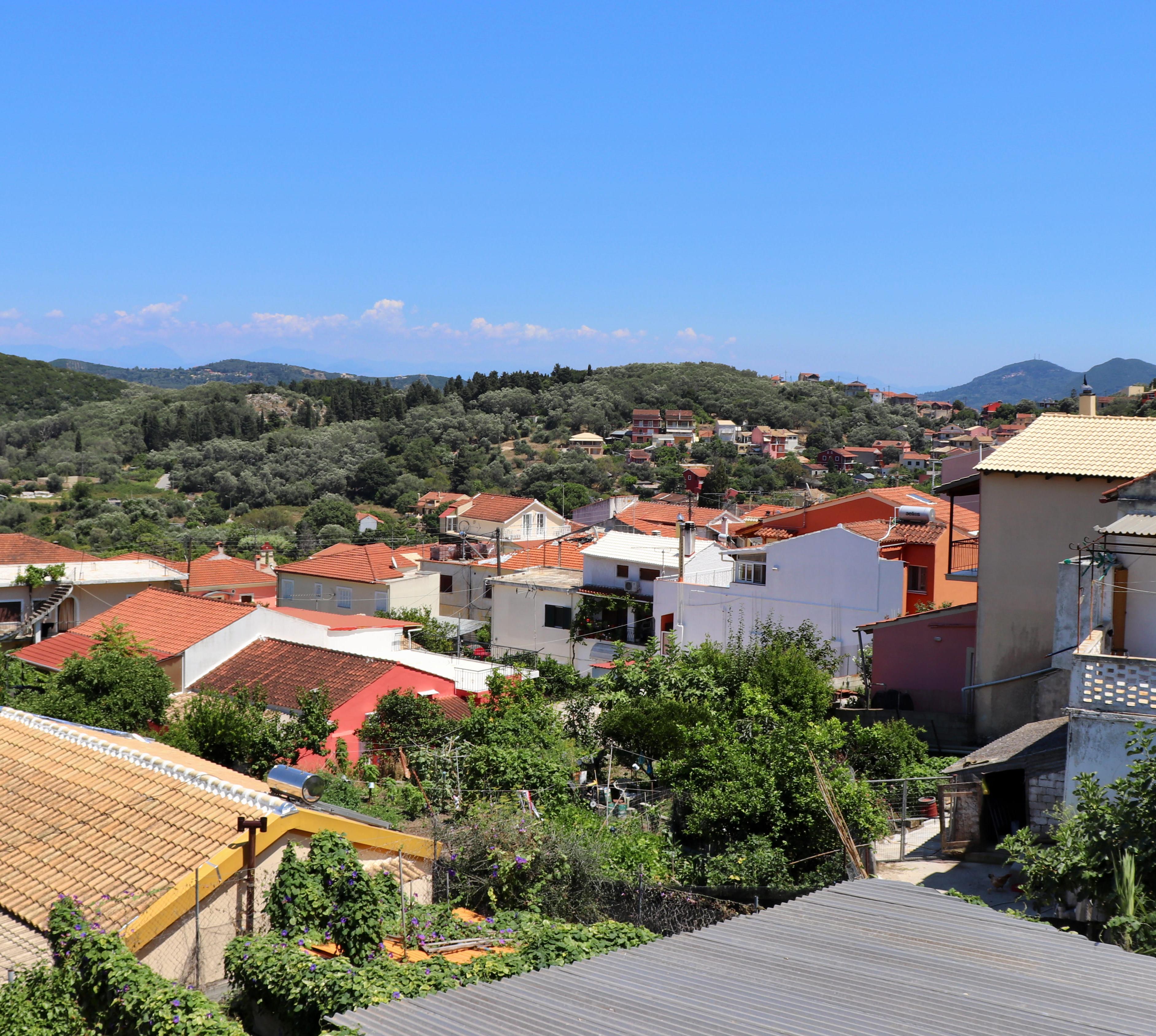 Das große Bergdorf liegt in einem besonders grünen Hochtal ohne Blick aufs Meer. Die meisten Bewohner leben vom Olivenanbau. Eine nur mit Jeeps befahrbare Piste führt zum 5 km entfernten, nicht mehr bewohnten Kloster Pantokrátoras hinauf.