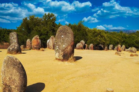 Wer die Comics um Asterix und Obelix gelesen hat, kennt die sogenannten Hinkelsteine - 15 km westlich von Évora ragt mit dem Menir dos Almendres ein Vertreter dieser Hünensteine auf. Er ist ca. 4 m hoch und typisch für die Megalithkultur, die 2 km weiter mit dem Kromlech von Almendres einen echten Höhepunkt erreicht. Umgeben von Korkeichenhainen, verteilen sich mehr als 100 Monolithe über das abfallende Gelände. Diese formen einen Steinkreis (Kromlech), der aus dem 5.-4.Jh. v.Chr. stammt. Anfahrt: von Évora aus knapp 9 km westwärts auf der N 114, dann ausgeschilderter Abzweig über Guadalupe, dahinter führt das letzte Stück über eine Piste.