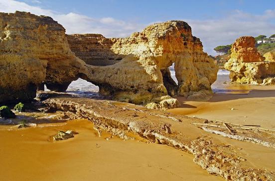 5km östlich, vor rostroten Felswänden mit Kiefernhainen und Mittagsblumen, erstreckt sich am Übergang zwischen Sand- und Felsalgarve einer der schönsten Strände der Algarve, der zu ausgiebigen Spaziergängen verlockt. 8 km östlich liegt vor einem wunderbaren Strand die 30 m hohe, mehrere Kilometer lange Steilwand, mit der die Felsalgarve ausläuft und in die flache Sandalgarve übergeht. Die Falésia-Wand besteht indes nicht aus Fels, sondern aus verbackenem rotem Sand, der leicht abbröckelt. Leg dich besser nicht direkt unter die Wand! Ansonsten: Auch für Kinder ist das weite Strandgelände mit seinem feinen Sand ein Spielparadies. Zu den einzelnen Abschnitten gibt es jeweils Zufahrten, in ihrer Nähe wird es in der Hochsaison fürs Parken wie fürs Baden eng.