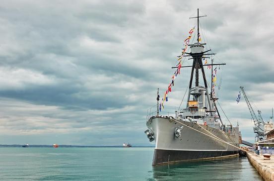 In Athens Museumshafen kann das Schlachtschiff "Averof" aus dem Ersten Weltkrieg ausgiebig besichtigt werden. Man vergleiche die Enge des Mannschaftsschlafraums mit dem Luxussalon des Admirals. Daneben liegen der Nachbau einer antiken Triere aus dem 5.Jh. v.Chr. und eine alte Inselfähre aus der frühen Nachkriegszeit.