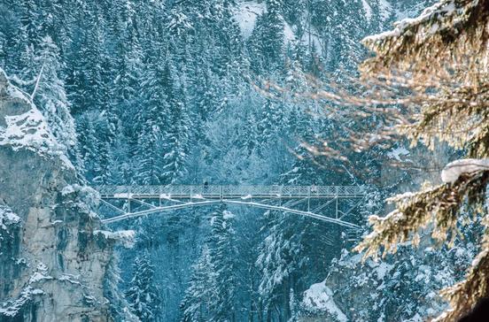 Beim Bau dieser Brücke 1866 wurde eine zur damaligen Zeit völlig neue Konstruktionsweise erprobt: In 90 m Höhe über dem Pöllatfall wurden die Träger von den auf beiden Seiten im Fels befestigten Verankerungen aus aufgestellt - ohne stützende Rüstung. Die Marienbrücke überspannt die von schroffen Felswänden gesäumte Pöllatschlucht, die schon zu König Maximilians Zeit als attraktives Naturereignis galt.