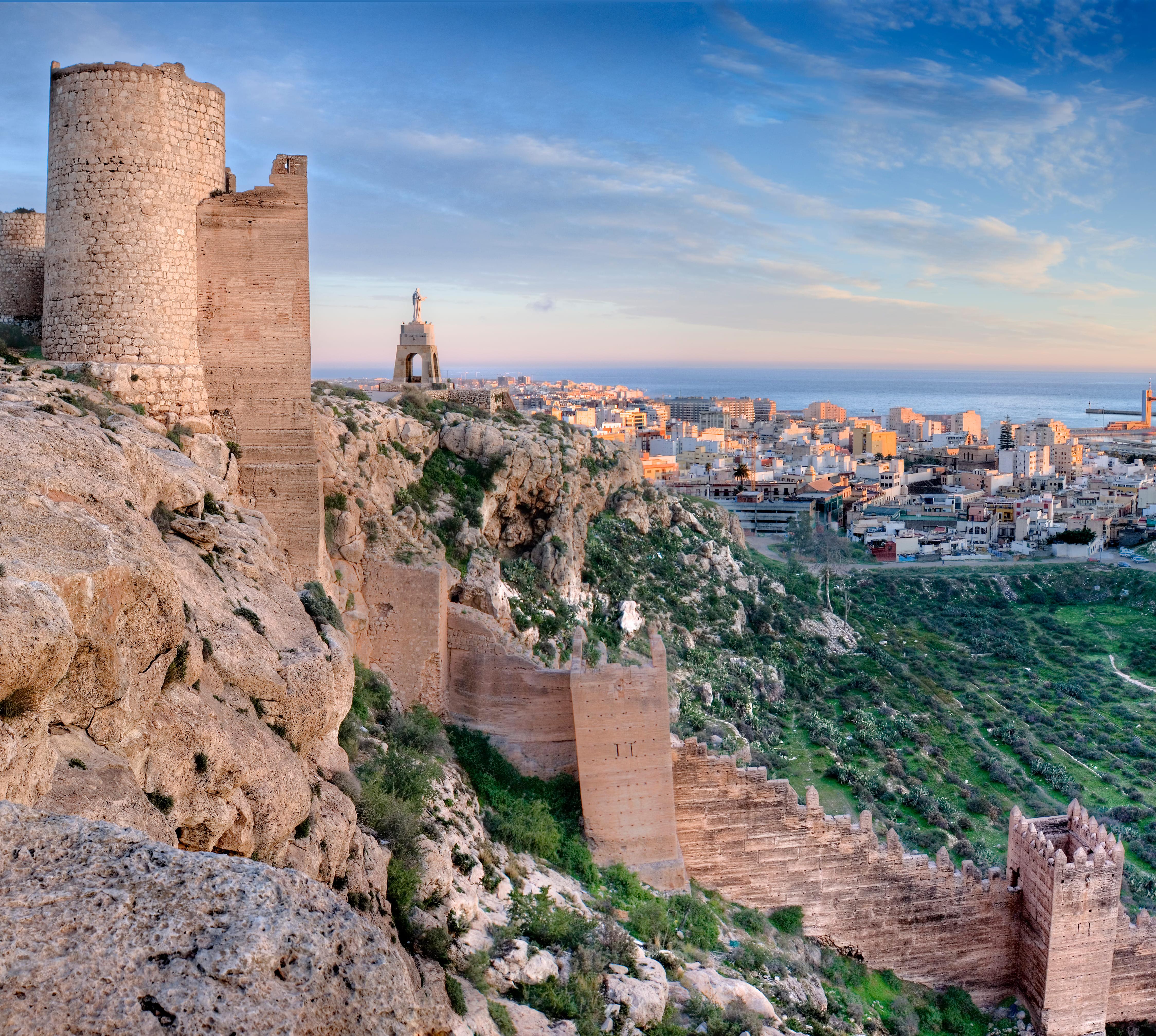 Der Zugang führt über Zickzackrampen und durch das hufeisenförmige Tor der Gerechtigkeit, die Puerta de la Justicia, hinauf auf die Burg, von der der Blick über Altstadthäuser, Flachdachterrassen und die Hafenanlagen mit ihren Kühllagern und Verladekränen auf die gleißende Weite des Mittelmeers geht.