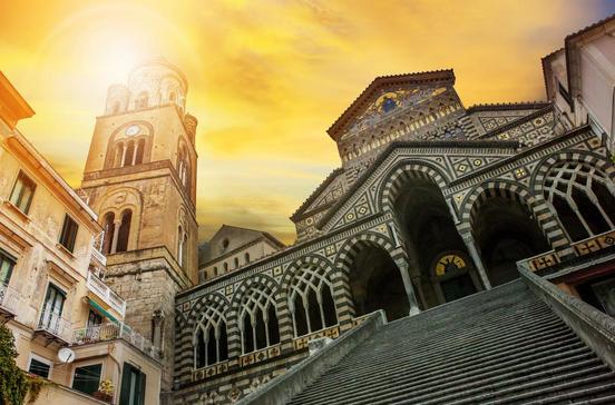 Am Kopf einer breiten, steilen Treppe erhebt sich der Dom mit einem Säulenatrium in schwarzem und weißem Marmordekor und bunt schillernden Giebelmosaiken. Ein Erdrutsch hatte die Kirche 1861 zusammenbrechen lassen, original getreu baute man sie wieder auf. Einzig der Kirchturm von 1180 mit seinen majo likageschmückten Minarettkuppeln war stehen geblieben. Schon vor dem Zusammenbruch war der Dom nicht aus einem Guss. So verbergen sich hinter dem breiten Säulenatrium zwei Kirchen und ein Kreuzgang mit arabischen, normannischen und barocken Stilelementen. Die Ursprungskirche ist die Cappella del Crocifisso aus dem 10.Jh., heute von ihrem barocken Stuck befreit und seit 1995 ein sehenswertes Dommuseum. Die drei schiffige Hauptkirche kam im 11.Jh., als die Seerepublik sich auf dem Gipfel von Reichtum und Einfluss fühlte, dazu. Sie besitzt ein Bronzeportal aus Konstantinopel, ein Meisterwerk orientalischer Kunst von 1066.Darunter geht es in die barock gestaltete Krypta mit dem Reliquiar des hl. Andreas, des ersten Apostels Jesu, der in Amalfi als Stadtpatron hoch verehrt wird. Der mit seinen Doppelspitzbögen orienta lisch anmutende Kreuzgang Chiostro del Paradiso aus dem 13.Jh. war einst der Friedhof der Amalfitaner Aristokratie.