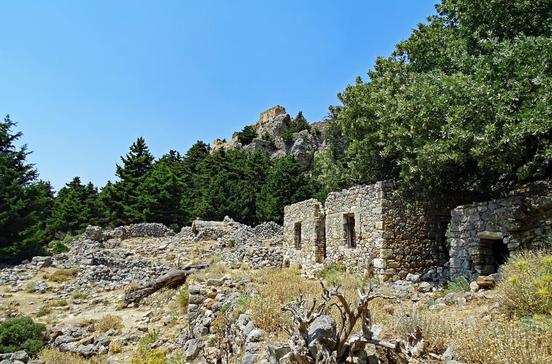 Die romantischsten Ruinen von Kos liegen einsam am Nordhang des Inselgebirges auf einem steil abfallenden Felsen. Hier liegen die steinernen Reste eines seit dem Mittelalter bewohnten und erst 1830 nach einer Choleraepidemie verlassenen Dorfs verstreut. Die Häuser sind mittlerweile zwar verfallen, aber vier der mittelalterlichen Kirchen stehen noch. Die am unteren Dorfrand gelegene und den körperlosen Erzengeln geweihte Kirche Asómati Taxiárches Gavriíl ke Michaíl mit spärlichen Freskenresten ist besonders stimmungsvoll.