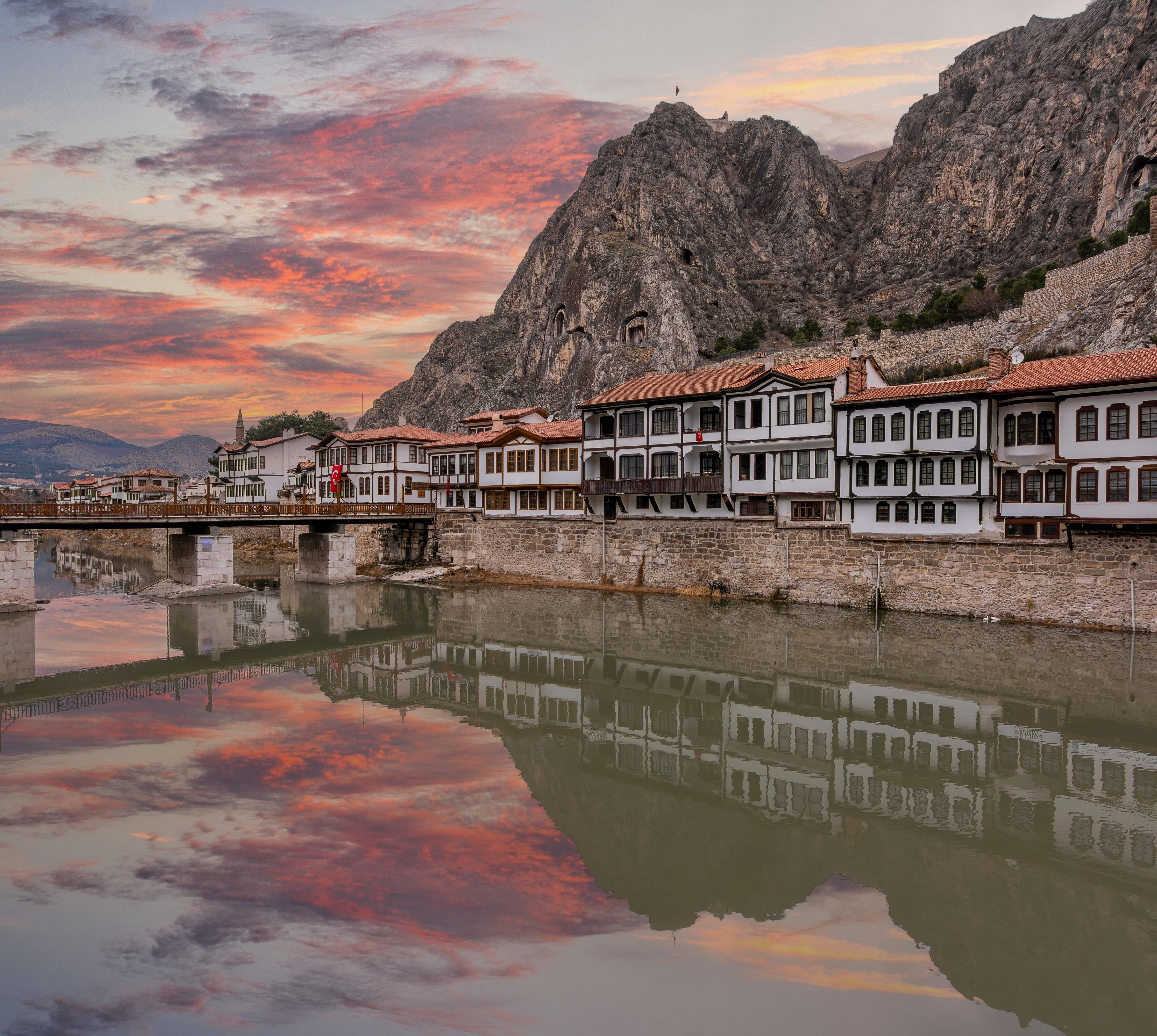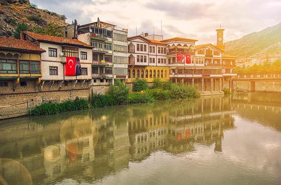 Das malerische Amasya wartet mit gut erhaltenen osmanischen Fachwerkhäusern auf, die entlang des Yeşilırmak ("Grüner Fluss") fast übers Ufer kragen. Dazu kommen seldschukische Bauten, Moscheen und Mausoleen sowie eine römische Festung. Amasya war Hauptstadt des griechischen Pontischen Reiches (ca. 300-70 v. Chr.), im Mittelalter regierten die Mongolen und bescherten der Stadt wirtschaftlichen Aufschwung. Danach verlagerten sich die Wirtschaftszentren gen Westen. Die Menschen leben heute v.a. von der Landwirtschaft.