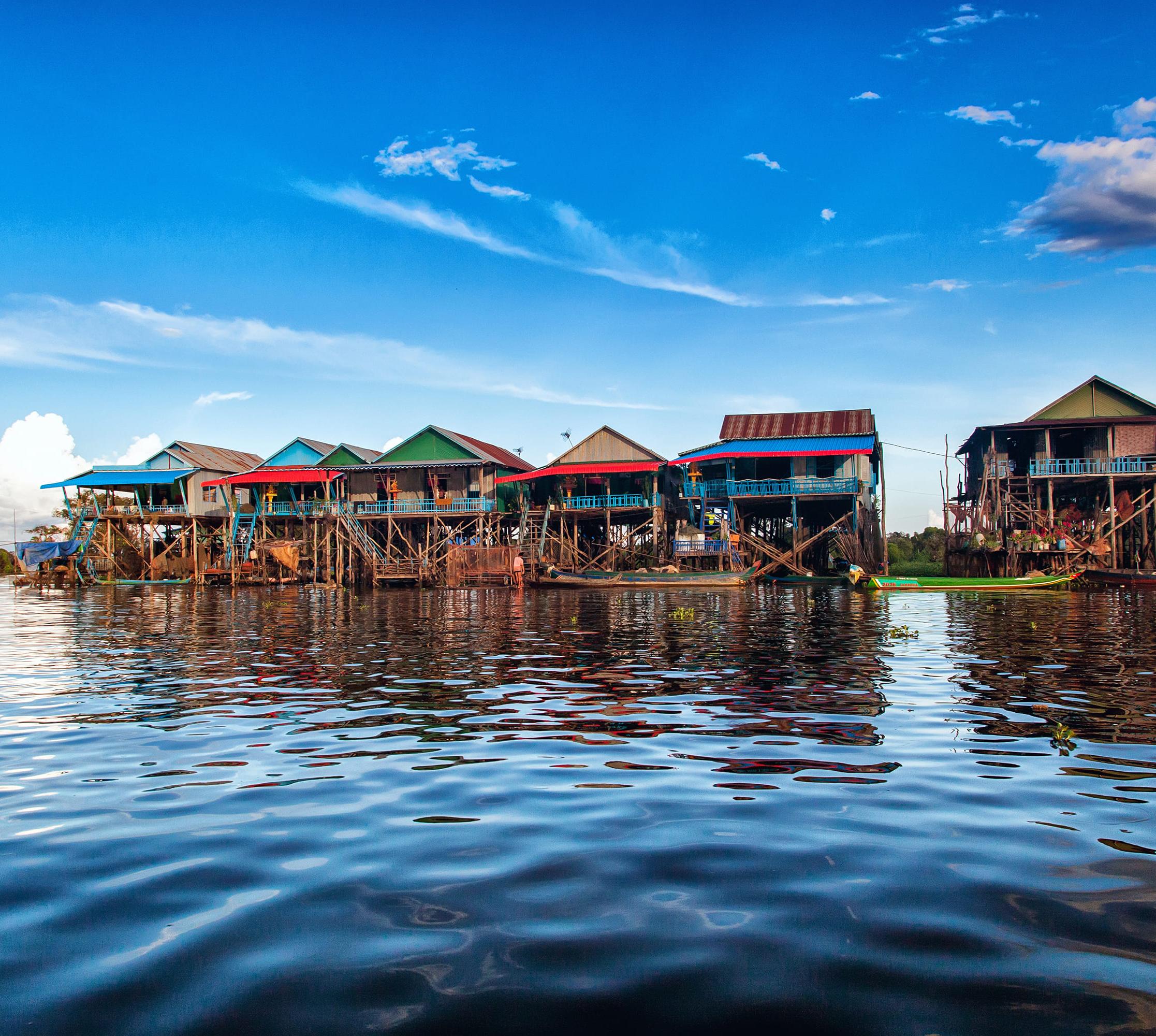 Jedes Jahr, wenn der Flussriese die Monsunmassen und das Schmelzwasser des Himalaya nicht mehr halten kann, wechselt sein Nebenfluss Tonle Sap die Richtung (Juni und Ende Oktober) und fließt rückwärts in den Tonle-Sap-See. Der See wächst um ein normalerweise gut Fünffaches (von 2500 auf 12 000 km²). Das Naturwunder macht den Tonle Sap angeblich zum fischreichsten Binnensee der Welt. Mit Wurfnetzen, Bambusreusen und Fangkammern fischen die Kambodschaner hier die zehnfache Fangmenge der Nordsee. Zieht sich das Wasser in der Trockenzeit wieder zurück, folgen die Kambodschaner mit ihren Hausbooten in „schwimmenden“ Dörfern. Ein Sprichwort besagt: Mean toek, mean trey (wo Wasser ist, sind Fische). Andere wohnen in Pfahlhaus-Siedlungen wie in Chong Khneas (8000 Ew.) und Kampong Phluk (3000 Ew.; beide in der Hochsaison überlaufen), wo sich die Häuser nach jahrtausendealter Methode wie mit einem Fahrstuhl dem Wasserstand anpassen – der Bambus-Fußboden wird einfach mit Seilen höher verankert. Weniger touristische Dörfer sind das eher ärmliche Kampong Khleang (ca. 50 km südöstlich von Siem Reap) mit seinen bis zu 10 m hohen Stelzen-Hochhäusern, was man in der Trockenzeit gut sehen kann, dann riecht es hier allerdings weniger gut ... Bei organisierten Bootsfahrten bzw. Kajaktouren.