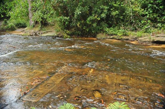 Wer meint, hier geht es nur zu einem xbeliebigen Wasserfall mit Picknickplatz und Selfiemöglichkeit, der irrt gewaltig: Hier wandelst du nicht nur in den Fußstapfen Angelina Jolies, sondern auch auf den Spuren des ersten Khmer-Königs – noch 350 Jahre vor dem Bau Angkor Wats! Eine gigantische lost City im Urwald: Mahendraparvata. Größer als Berlin und möglicherweise das zu jenen Zeiten größte Reich auf Erden, die größte Metropole aus dem 12.und 13.Jh. Die wahren Ausmaße des städtisch angelegten Reichs mit seinen heute unter der Vegetation verborgenen Überresten eines modernen Straßennetzes mit Dämmen und Gräben, Wasserbecken und Kanälen am Fuß des Phnom Kulen haben französische und australische Archäologen mithilfe der Laser-Scan-Technologie Lidar erst seit 2012 festgestellt und in Modellen sichtbar machen können. Selbst das monumentale Sakralbauwerk Angkor Wat war in dieser mittelalterlichen Megacity nur ein winziger Fleck. Der 487 m hohe, heilige Phnom Kulen im gleichnamigen Nationalpark wird jedoch schon länger als Geburtsstätte des Khmer- Imperiums betrachtet. 802 n. Chr. ließ sich Jayavarman II. hier als erster devaraja, ein gottgleich verehrter König, krönen und gründete sein Reich Mahendraparvata, das kurze Zeit später nach Roluos verlegt wurde. Vor allem an Wochenenden zieht es viele Khmer zum Wat Preah Ang Thom auf dem Gipfel mit herrlichem Ausblick, wo sie am ca. 10 m langen, ins Nirwana eingegangenen Buddha Opfergaben darbringen und dann zum Picknick am nahe gelegenen 30 m hohen zweistufigen Wasserfall gehen. Tief im Regenwald am westlichen Ausläufer des riesigen Phnom-Kulen-Plateaus versteckt sich der Kbal Spean (auch: Fluss der tausend Lingas), der erst 1969 von einem französischen Wissenschaftler entdeckt wurde. Der Bach fließt seit fast tausend Jahren über zahllose in den Fels geschlagene Reliefs: Szenen aus dem Ramayana, der liegende Vishnu, Brahma und Shiva, Apsaras und über Hunderte von kleinen Lingas, die phallusartigen Fruchtbarkeitssymbole, die Shiva symbolisieren und die das Flusswasser quasi automatisch durchs Drüberfließen segnen und für die Bewässerung der Reisfelder fruchtbarer machen sollten. Den leicht ansteigenden Weg solltest du nicht verlassen, da die Gegend bis 1995 Kampfgebiet war und derzeit noch von deutschen Fachleuten entmint wird. Eine Überraschung birgt die Weiterfahrt nach Srah Damrei an den Rand des ca. 350 m hohen Kulen- Plateaus, wo große Sandsteinskulpturen warten: ein Elefant, Löwen, Ochsen und Frösche.