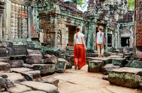 Angkor ist zwar Weltkulturerbe der Unesco, jedoch alles andere als ein Museum: Auf dem Gelände leben und arbeiten rund 30 000 Menschen, vor Buddhastatuen liegen Räucherstäbchen und kleine Gaben. Hochzeitsgesellschaften posieren vor Angkor Wat, dem weltgrößten Sakralbau: Die Khmer-Braut in gold-glitzerndem Kostüm und mit Krönchen könnte als Prinzessin aus dem Reich König Jayavarmans VII. auferstanden sein – wären da nicht die unzähligen Touristen um sie herum. 6 km weiter hat sich Siem Reap vom verschlafenen Marktflecken in ein trubeliges Touristenzentrum verwandelt. Per Boot schippern Ausflügler von hier zum schier endlosen Tonle-Sap-See mit Hausboot- Siedlungen und Stelzen-Hochhäusern oder ins reizende Battambang.