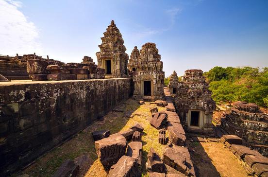 In spektakulärer Lage auf den steil abfallenden Damrek-Bergen thront der Preah Vihear sozusagen über dem äußersten Norden Kambodschas. Der Tempel (9.–12.Jh.) liegt auf kambodschanischem Boden im Grenzgebiet zu Thailand. 2008 hat die Unesco Preah Vihear zum Weltkulturerbe ernannt, seitdem ist ein heftiger, seit Jahrhunderten schwelender Grenzkonflikt wieder aufgeflammt, ein Ende ist nicht absehbar. Über steile Naga-Treppen und vier Terrassen steigt das Heiligtum wie ein Götterthron mit gopura-Pavillons, Säulen, Türmen und Galerien bis auf 600 m Höhe an. Auf dem obersten Plateau bricht der Boden an einer Felsenklippe senkrecht ab und bietet einen atemberaubenden Blick über das Land, das sich leer und verlassen zu Füßen der Tempelbesucher erstreckt. In der Gegend gibt es wegen der starken Verminung kaum Siedlungen. Der noch immer selten von Kambodscha aus besuchte Tempel war jahrelang von Thailand aus besser zugänglich – mit massenhaftem Ansturm thailändischer Reisegruppen. Derzeit jedoch ist der thailändische Zugang gesperrt, was den Tempel zu einer der ruhigsten und abgelegensten Unesco-Tempel-Oasen in ganz Asien macht! Nach einem UN-Richterspruch herrscht Ruhe in der Gegend, das Auswärtige Amt warnte bei Redaktionsschluss dennoch vor Reisen nach Preah Vihear – erkundige dich vor deiner Reise nach der Lage.