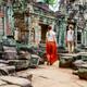 Von den Wurzeln der Kapok-Baumriesen und Würgefeigen überwuchert, gesprengt und gleichzeitig zusammengehalten, herrscht zwischen den Trümmerbergen, den Türmen und schiefen Türstürzen von Ta Prohm eine geradezu verwunschene Atmosphäre. Weil das 1186 von Jayavarman VII. erbaute Kloster (ca. 7 km nordöstlich von Angkor Wat) mit Absicht von der Res-taurierung ausgeschlossen wurde (mit Ausnahme der Holzstege), ist dies heute einer der faszinierendsten und stimmungsvollsten Orte in Angkor und zeigt, wie vergänglich die Bauwerke sind. Hier kannst auch du dich wie Henri Mouhot, einer der ersten (Wieder-)Entdecker Angkors, fühlen oder wie Angelina Jolie im Actionfilm „Tomb Raider“, von dem 2000 eine Schlüsselszene hier gedreht wurde. Manche nennen ihn daher den „Angelina-Jolie-Tempel“: Hollywood ließ seine Lara Croft per Fallschirm auf dem Phnom Bakheng landen und von echten Mönchen segnen, im Ta Prohm über (Styropor-)Balustraden hechten und setzte sogar Raketenwerfervor den Ruinen in Szene. Man muss nur eine Lücke zwischen den Reisegruppen abpassen (die südöstlich in der Nähe liegende Klosterruine Banteay Kdei aus dem 12./13.Jh. wäre eine ähnlich faszinierende Ausweichmöglichkeit, oder du lauscht den behinderten Khmer-Musikanten am Eingang). Ta Prohm ist ein buddhistischer Flachtempel, Wassergräben und quadratische Galerien umschließen ihn. Fast unvorstellbar angesichts des labyrinthischen Steinechaos in den Höfen: In der antiken Universität lebten einst rund 12 000 Menschen, darunter viele Mönche. Besonders schön und ruhig frühmorgens bei Sonnenaufgang bis ca. 7.30, und nach 16 Uhr.