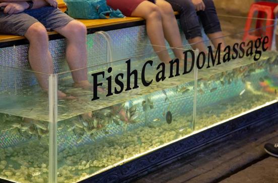 Der witzig-kitzlige Trend in Asien: Füße bei der Besichtigung der Tempel wundgelaufen? Kein Problem für Dr. Fish: Diese angesagte Wellness-Institution und Pediküre mit akademischem Grad lässt Garra-Rufa-Winzlinge (auch Kangal-Fischegenannt) an Hornhaut und Schuppen knabbern (ursprünglich stammt diesetierische Spa-Behandlung übrigensaus der Türkei, wo sie schon im 19.Jh.angewendet wurde).