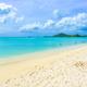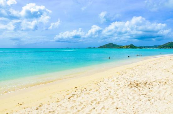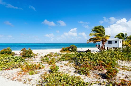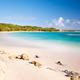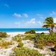 Langer weißer Sandstrand, vor dem die Karibik und der Atlantik zusammentreffen.
