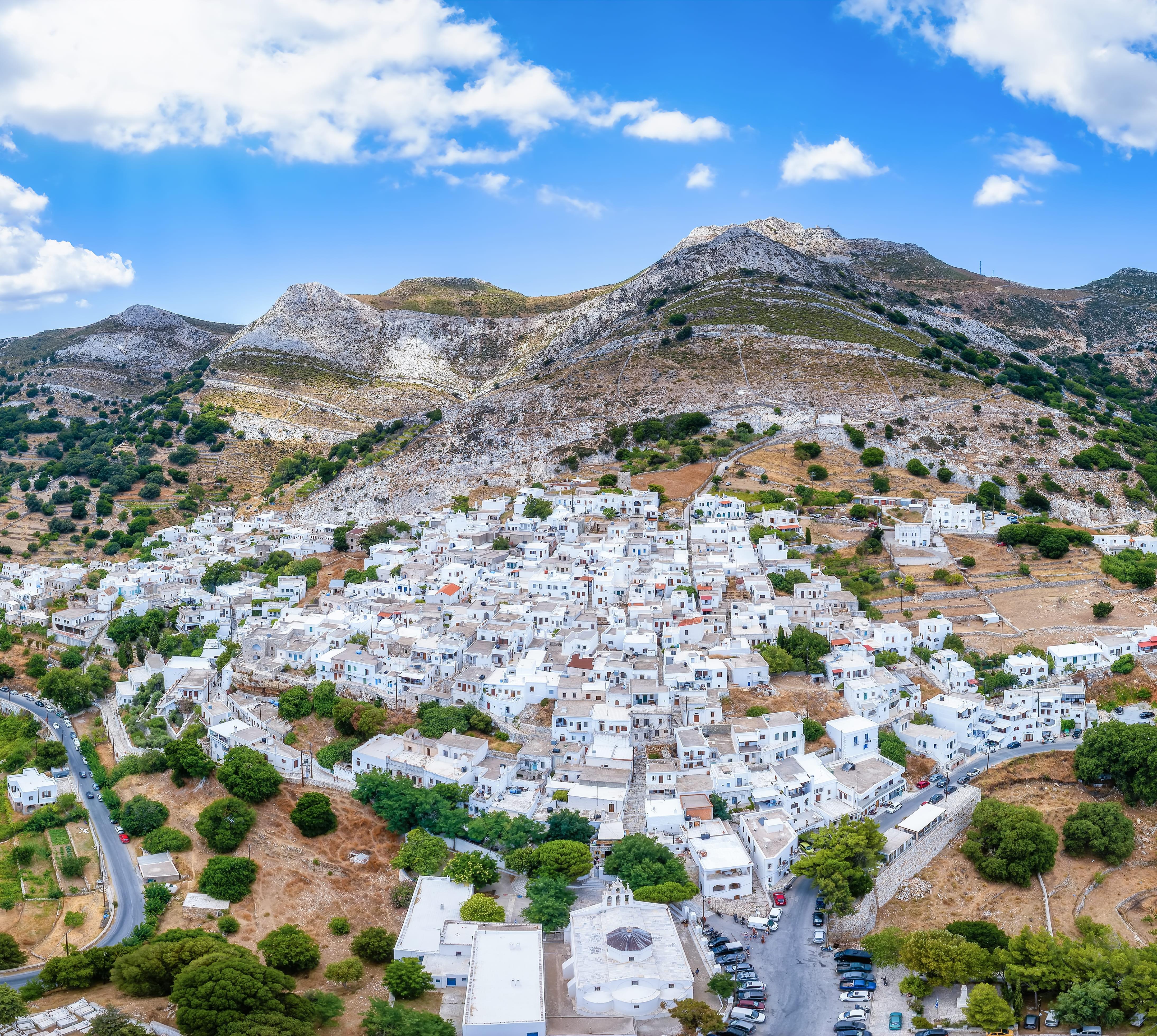 Filóti liegt am obersten Rand der Hochebene Tragéa. Am lang gestreckten Dorfplatz direkt an der Hauptstraße stehen viele Kaffeehäuser und einige Tavernen. Von hier aus hat man einen grandiosen Blick auf die Tragéa, das Meer und den alpin anmutenden Berg Zas.