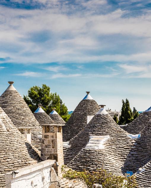 Rollen wir Apulien von seiner südlichsten Spitze auf, eben dem Salento, mit seinen vielfältigen Stränden – mal abenteuerliche Klippen, mal glatte Kiesel, mal feiner Sand. Badeorte wechseln sich mit alten Hafenstädtchen ab. Urbaner Höhepunkt ist die wunderschöne Barockstadt Lecce im Innern des Salento – mit ihrer Universität, ihren Bars, Restaurants und schicken Läden. Zur Hochsaison Ende Juli/Mitte August wird es an den Stränden um Gallipoli oder Otranto sehr voll. Wem das zu viel wird, der kann ins Landesinnere ausweichen und findet dort endlose Olivenhaine, beschauliche Ortschaften und Trattorien mit guter Küche. Auf den Salento folgt die Valle d’Itria, eine Gartenlandschaft mit Weinbergen, Feigen-, Oliven- und Mandelbäumen. Zwischen den Baumwipfeln ragen die Spitzdächer der runden trulli hervor, der wohl drolligsten Häuschen im Süden. Tausende gibt es davon, mit Alberobello sogar eine ganze Stadt. Dazu gesellen sich Morgenlandstädtchen wie Ostuni, Locorotondo und Cisternino mit ihren in strahlendem Weiß gekalkten Häuserwürfeln. Hier konzentrieren sich auch die Masserien, hochherrschaftliche alte Gutshöfe, heute oft in luxuriöse Traumhotels umgewandelt.