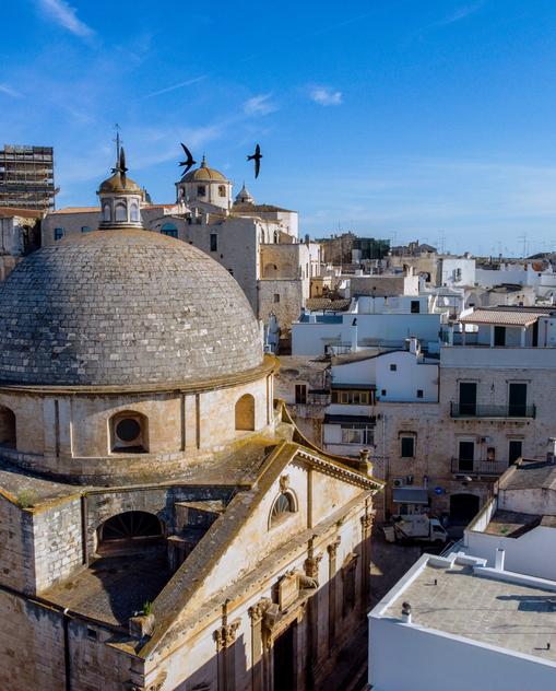 Hier geht es durch das Herz Apuliens, die sanft geschwungene Gartenlandschaft der Valle d’Itria. Zwischen zwei uralten Hafenstädten erstreckt sie sich – dem römischen Brindisi an der Adriaküste und der einst griechischen Hafenstadt Taranto an der Westküste. Dazwischen weiß getünchte Städtchen wie Ostuni oder Locorotondo und weiße, in Luxushotels verwandelte Gutshöfe. Dann das elegante Barockstädtchen Martina Franca, aber auch Grottaglie voller Werkstätten mit bunter Keramik sowie das Winzerstädtchen Manduria. Eine Welt wie aus dem Märchen tut sich auch unter der Erde auf, in Italiens größter Tropfsteinhöhle.