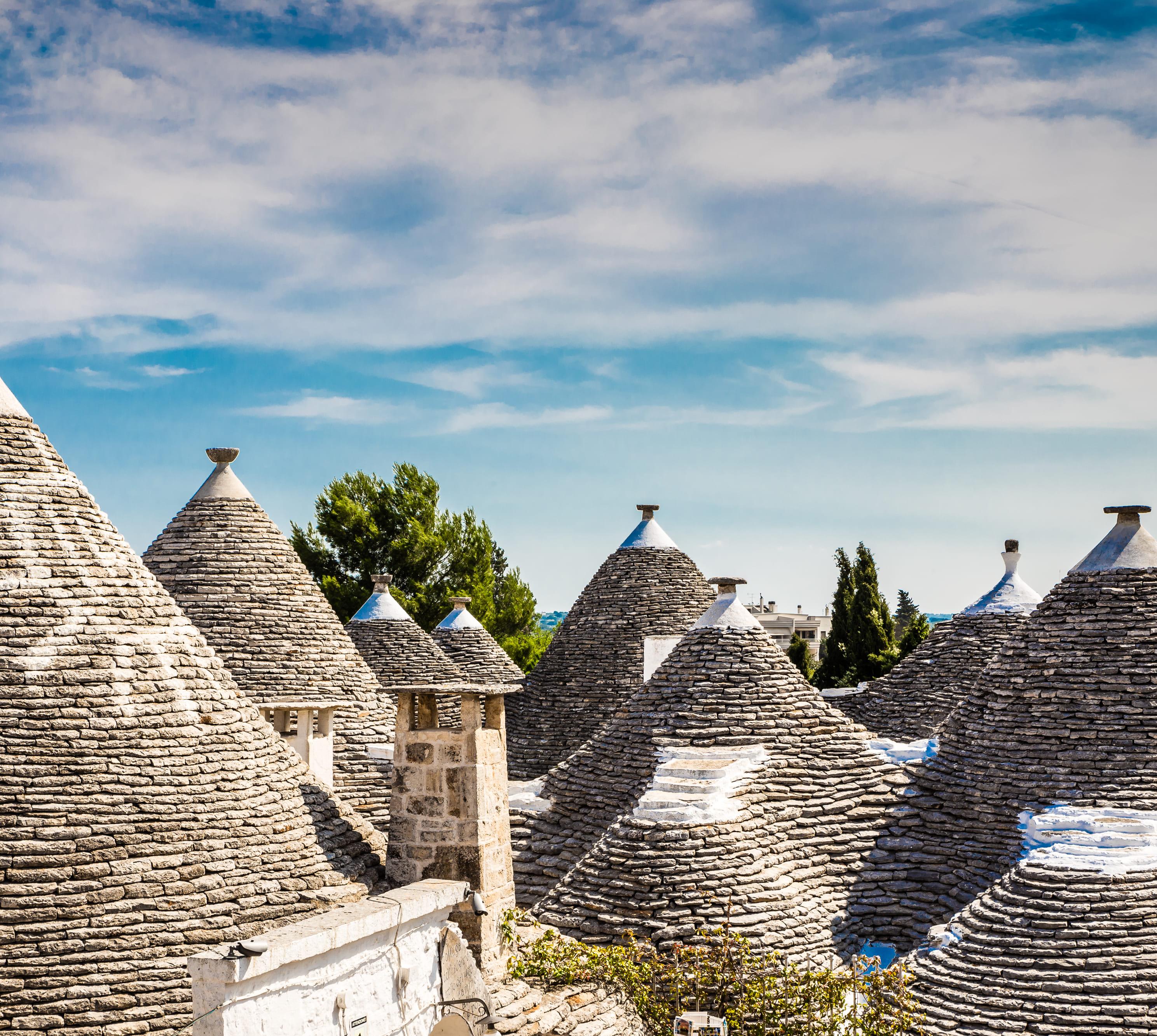 Wer hat sich diese Zipfelhäuschen ausgedacht? In Grüppchen ragen die Spitzdächer zwischen Oliven-, Mandel- und Feigenbäumen hervor, in Alberobello bilden sie Zipfel an Zipfel sogar eine ganze Stadt.