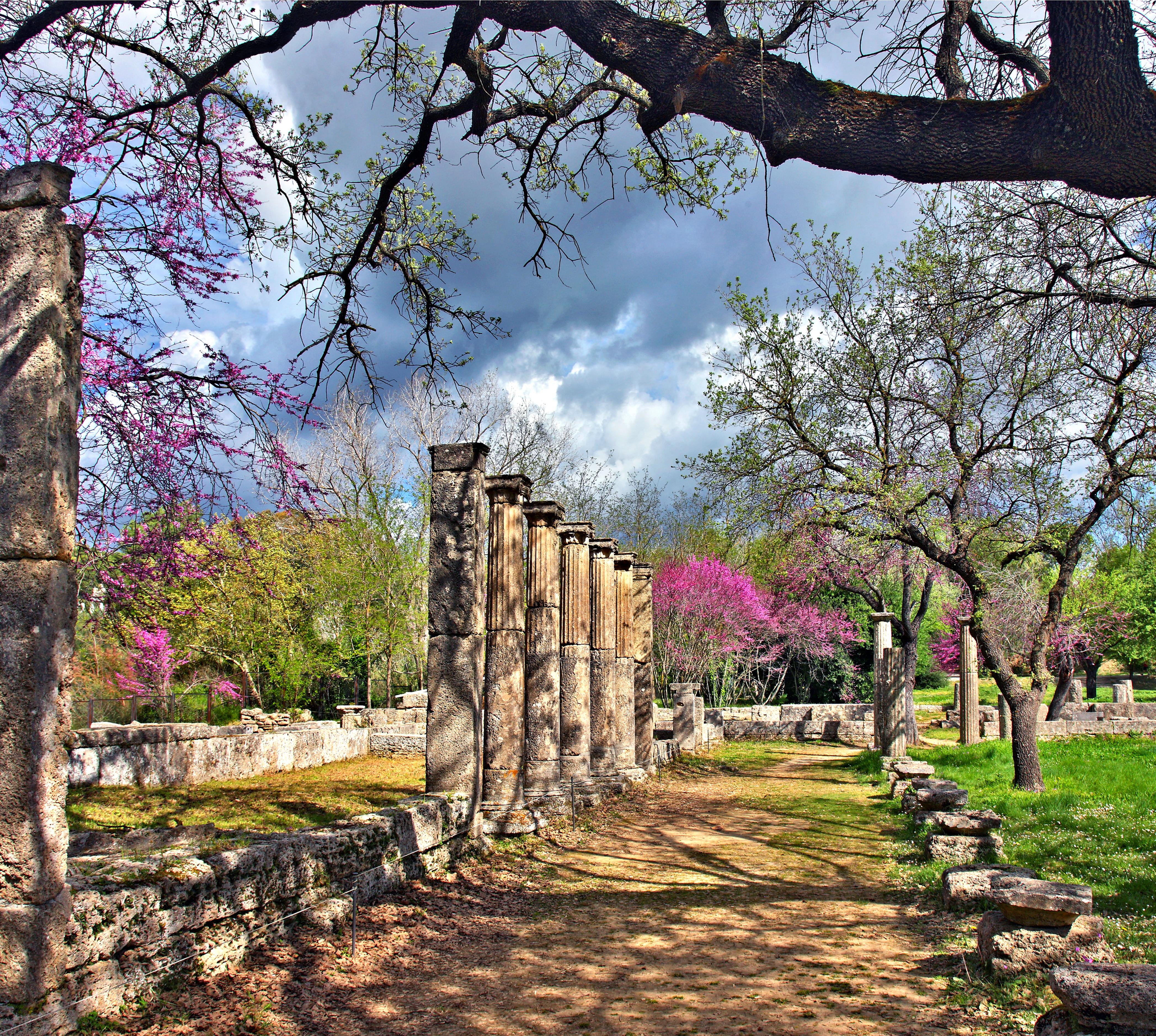 Hier bist du da, wo vor über 2700 Jahren die Geschichte der Olympischen Spiele begann. In einem grünen Tal zwischen grünen Hügeln in purer Ländlichkeit. In einem modernen Dorf namens Olimbia mit nur 1300 Einwohnern, das inzwischen fast nur noch vom Tourismus lebt. In einer parkähnlichen Ruinenlandschaft, die dir viel über die ersten 1100 Jahre olympischer Geschichte erzählt. Hier solltest du mindestens einen vollen Tag lang bleiben. Seit 1875 legt das Deutsche Archäologische Institut frei, was aus der über 1100 jährigen Geschichte des dem Göttervater Zeus geweihten Heiligtums erhalten geblieben ist. Für 776 v. Chr. sind erstmals Olympische Spiele belegt. Bis zum Verbot sämtlicher heidnischer Kulte durch den oströmischen Kaiser Theodosius 395 fanden die Olympischen Spiele alle vier Jahre statt. Sie waren zusammen mit den stärker musisch ausgerichteten Spielen von Delphi und den Isthmischen Spielen bei Korinth das größte gesamtgriechische Fest. Es brachte Teilnehmer aus vielen griechischen Stadtstaaten zusammen, die sich sonst häufig befehdeten und keineswegs ein einheitliches Volk bildeten. Während der Zeit der Olympischen Spiele mussten alle Waffen ruhen; die Wettkämpfe waren eine Art Kriegsersatz. Nur der Sieger erhielt als Trophäe einen Ölzweig; Silber und Bronzemedaillen gab es damals noch nicht. Anfangs wurde nur ein Wettbewerb ausgetragen, der Stadionlauf über eine Distanz von192 m. Noch im 8.Jh. v. Chr. kamen der doppelte Stadionlauf, ein Langstreckenrennen über 4600 m und ein Fünfkampf hinzu. Später ergänzten Wettbewerbe wie Faustkampf und Wagenrennen die Spiele. Bis 472 v. Chr. fanden alle Wettkämpfe an einem einzigen Tag statt, danach wurden die Spiele auf fünf Tage aus gedehnt. Nur freie männliche Griechen (und in römischer Zeit auch freie Römer) durften teilnehmen. Frauen war das Zuschauen bei Todesstrafe verboten.