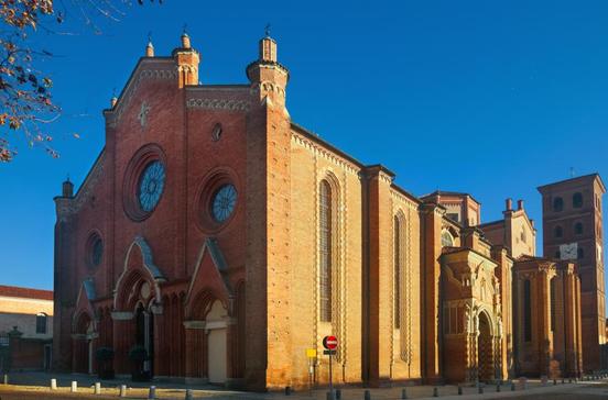 Stilisiertes Weinlaub umrankt die hohen Pfeiler, auf denen die dreischiffige gotische Stufenhalle ruht. Im Volksmund wurde der im 14.Jh. errichtete Dom, eines der wichtigsten gotischen Bauwerke des Piemont, deshalb zu „La Vigna“, dem Weinberg. Im Inneren des Doms sind ein frühromanisches und ein gotisches Weihwasserbecken zu bestaunen (Ersteres sitzt auf römischen Kapitellen). Die schlichte Westfassade mit je drei Stufenportalen und Fensterrosen wird übertroffen von der Südfront mit rotweiß gewürfelten Fensterrahmungen und einem üppig dekorierten Portal im Stil der französischen Gotik.