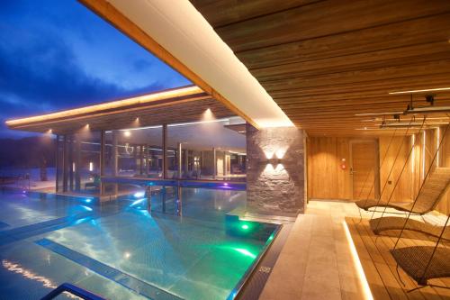 Umgeben von einem 10.000 m2 großen Garten bietet der Wellnessbereich verschiedene Saunen und Dampfbäder, einen modernen Fitnessraum, Ruhezonen, ein Spa-Bistro und eine Sonnenterrasse mit Bergblick.