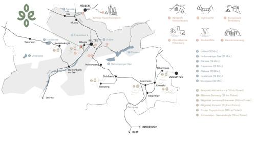 Zum Schloss Neuschwanstein gelangen Sie in 30 Fahrminuten. Nach einer 20-minütigen Fahrt erreichen Sie das Skigebiet Zugspitz Arena. Die Hängebrücke highline179, die längste Fußgänger-Hängebrücke im tibetanischen Stil, befindet sich eine 10-minütige Fahrt entfernt.