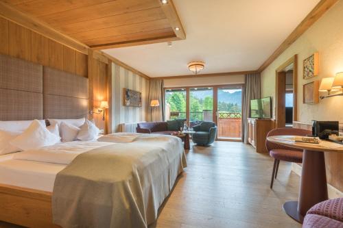 Die elegant eingerichteten Zimmer verfügen allesamt über einen Flachbild-Sat-TV, eine Minibar im Stile eines alpenländischen Kachelofens sowie einen Balkon mit Panorama-Bergblick. Im Bad erwarten Sie eine Dusche, ein Haartrockner sowie Bademäntel.