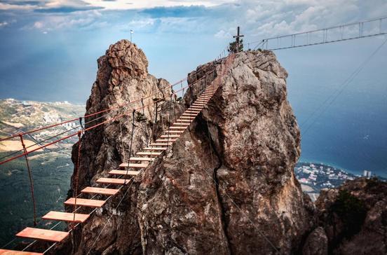 Die Spitzen von Jaltas Hausberg (1234 m) bestehen aus Korallen. Die karge Hochebene rund um den Gipfel erinnert an eine Mondlandschaft. Wanderer brauchen etwa 2,5 Stunden. An der Bergstation wetteifern rund 30 krimtatarische Lokale um Gäste.