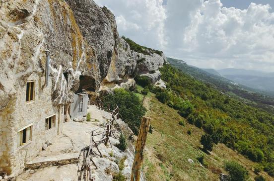 Das Kloster krallt sich dramatisch an den mächtigen Felsen. Eine steile Treppe führt zur Hauptkirche, die byzantinische Mönche im 9.Jh. in den Berg schlugen. Im Innern der Höhlenbasilika mittelalterliche Fresken. Seit 1993 leben im Kloster wieder Mönche.
