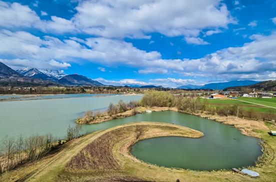 In Selkach erlebst du eine unwirkliche Landschaft: Drei Künstler haben aus Schlamm aus der mächtigen Drau ein „Land-Art-Projekt“ geschaffen: Eine Grasschnecke ragt aus dem Wasser und wird zu grünen Hügeln. Highlight ist eine „Gipfel-Pfütze“, die dank eines Windrads ständig mit frischem Wasser versorgt wird, das wiederum zum Spiegel für die schroffen Berge der Karawanken wird.