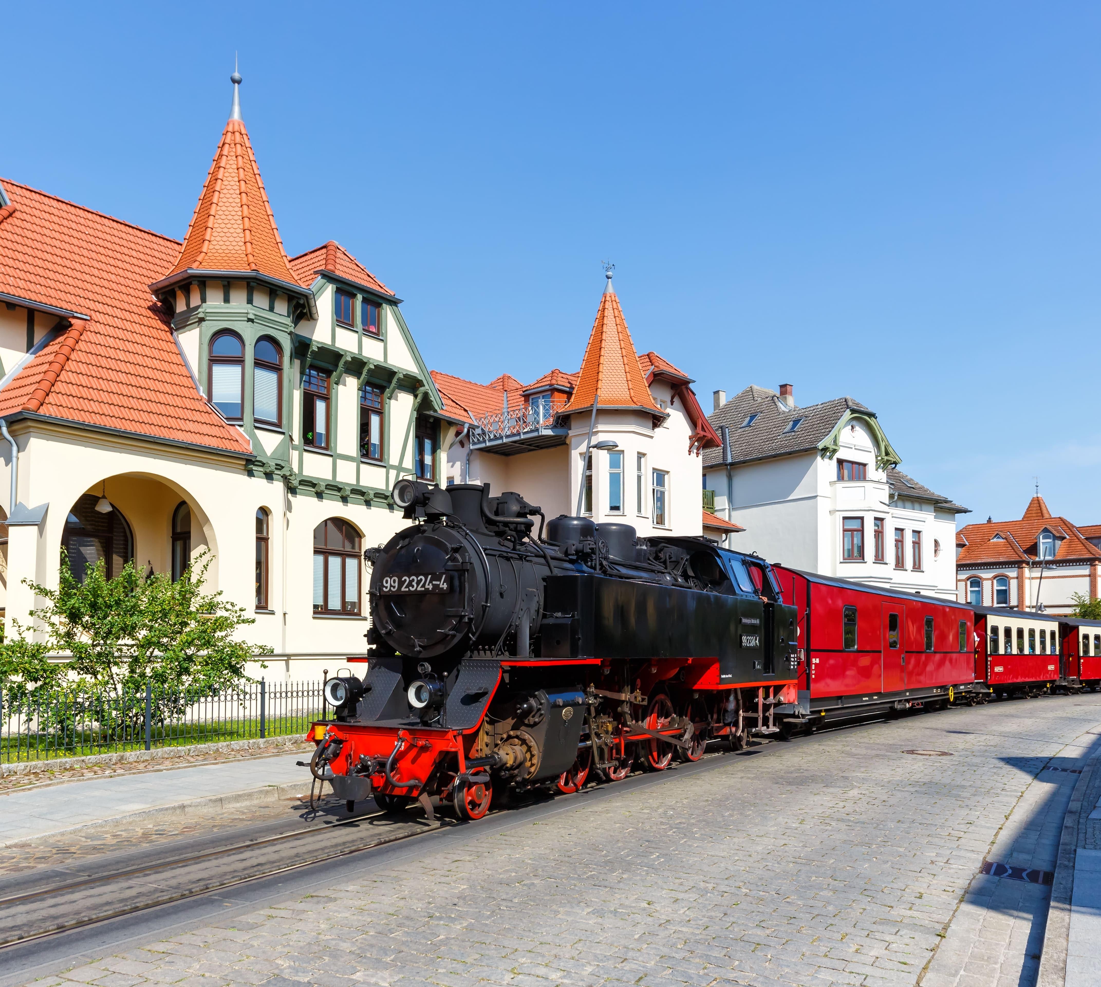 Parallel zu einer Lindenallee und am Mischwald Großer Wohld vorbei schnauft der Zug zunächst dem 6 km entfernten Ortsteil Heiligendamm zu. Das Schweriner Herzogshaus hatte Doberan zur Sommerresidenz erkoren, und am Heiligen Damm nahmen Durchlaucht und seine Gäste ein Bad in der Ostsee.