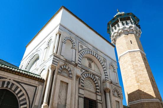Im 8.Jh. entstand ein erstes Gotteshaus, das mehrmals umgebaut wurde. Ab dem 13.Jh. avancierten die Zitouna und die ihr angeschlossenen Lehranstalten, die Medresen, zur bedeutendsten Hochschule des Landes und zur drittwichtigsten der islamischen Welt. Neben Theologie wurden Philosophie, Astronomie und Medizin unterrichtet. Heute ist die Ausbildung der Studenten an die Universität von Tunis verlagert. 184 von antiken Kapitellen aus Karthago gekrönte Säulen gliedern den Gebetssaal. Nichtmuslimen ist der Zutritt untersagt, sie können allerdings vom Innenhof aus einen Blick auf den im Dämmerlicht liegenden Raum erhaschen. Sehenswert ist das schöne Vierkantminarett mit Stuck- und Majolikadekor.