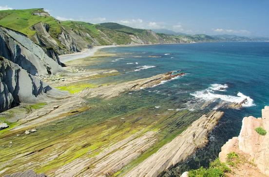 Von San Sebastián windet sich die traumhafte Küstenstraße N 634 über Zarautz und Getaria bis nach Deba. Hinter jeder Kurve gibt es neue Perspektiven auf Berg und Meer – atemraubend! Das grüne Hinterland ist von Bauerndörfern und Berghöfen geprägt. Bevorzugtes Ziel wohlhabender Basken ist Zarautz, das sich durch den längsten Sandstrand weit und breit auszeichnet. Am Hafen von Getaria reihen sich Restaurants auf. Probieren solltest du einmal den txakolí, den leicht moussierenden Weißwein aus dem Baskenland, der in den Weingütern um Getaria produziert wird. Wichtige Stationen weiter westlich sind Zumaia mit seinen Stränden und der markanten Gesteinsformation Flysch, die Hafenstädtchen Lekeitio und Bermeo, das Cabo de Matxitxako und die spektakulär hoch über der See gelegene Felsenkapelle San Juan de Gaztelugatxe. Stell dich auf reichlich Kurven ein: Die Straße führt streckenweise durch hohes Küstenhinterland.