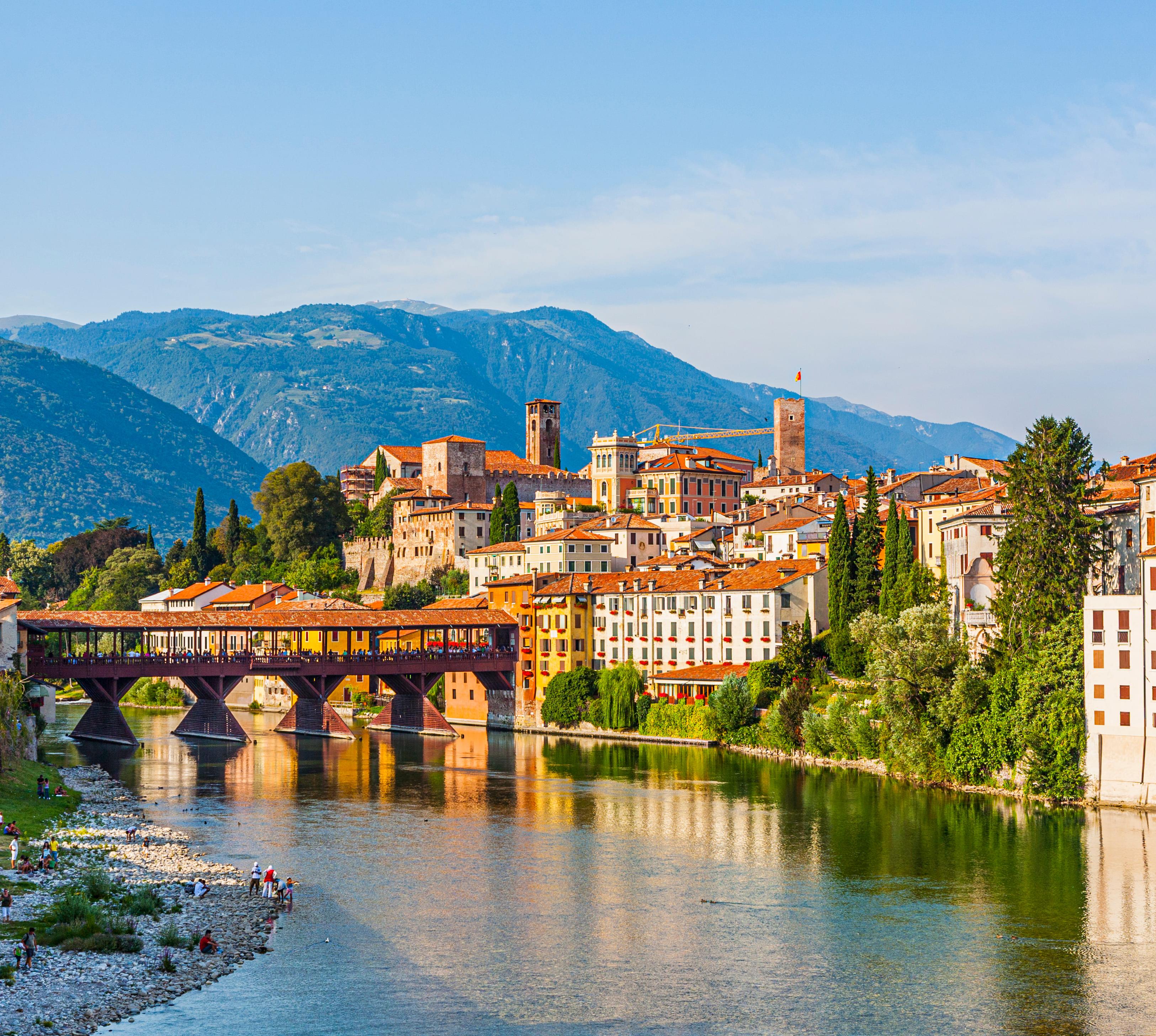 Im Stadtbild von Bassano (42 000 Ew.), in den Voralpen über dem Brenta gelegen, zieht die stattliche, aufwendige Holzbrücke über den Fluss alle Aufmerksamkeit auf sich: ein Entwurf Andrea Palladios von 1569, mehrfach durch Überschwemmungen und Kriege zerstört und weltberühmt, stets genauso wiederaufgebaut. Im östlichen Brückenkopf liegt die wunderschöne historische Kneipe der legendären Grappadestillerie Nardini, in der Via Gamba 6 außerdem ein Grappamuseum. Die Kenner zieht es ins sich südlich an Bassano anschließende Rosà zum leidenschaftlichen Grappameister Gianni Capovilla. Im Museo Civico im ehemaligen Franziskanerkloster lohnen die archäologischen Funde, kostbare Handschriften und die Werke Antonio Canovas sowie des hiesigen Malers Jacopo da Bassano. Die Handwerkstradition der Keramik ist hier sehr lebendig, wie die vielen Läden zeigen; die Keramiksammlung ist im sehenswerten Palazzo Sturm über dem Brenta untergebracht. Im großen Traditionslokal Birraria Ottone isst und sitzt man sehr gemütlich. Im Frühsommer reift hier in der Gegend der weiße Spargel, den du gut zubereitet wenige Kilometer nordwestlich in Valrovina im Melograno bekommst. Ein Ausflug auf den Monte Grappa (1775 m) mit phantastischem Bergpanorama führt zu einer gewaltigen Gedenkstätte für Gefallene des Ersten Weltkriegs – eine der vielen, denen man im Veneto und im Friaul begegnet.