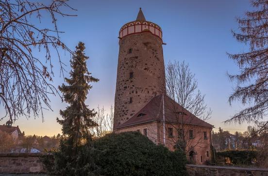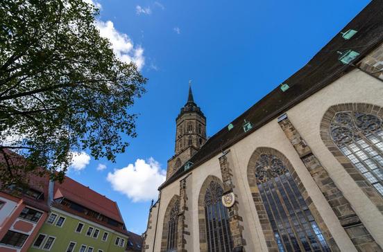 Die einzige Simultankirche im Osten Deutschlands. Seit 1534 nutzen Katholiken den Chorraum und evangelische Christen das Langhaus. Damit sich die Konfessionen nicht ins Gehege kommen, trennt sie eine ein Meter hohe Barriere. 214 Stufen führen zur Aussichtsplattformin 52 m Höhe.