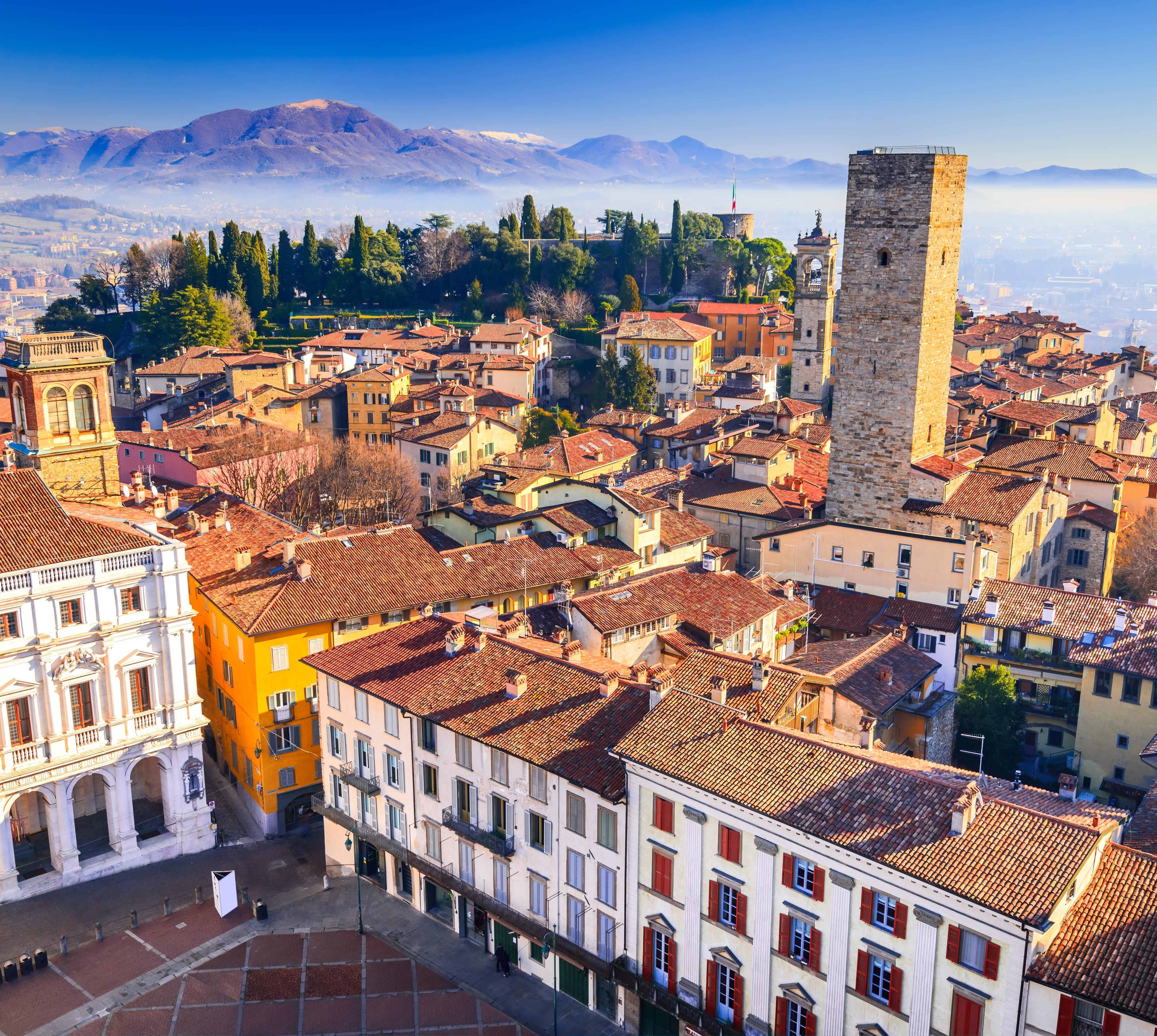 Sie thront zwischen der Poebene und den Voralpen am Ausgang der grünen Täler von Brembo und Serio. Nach einer kurzen Zeit als freie Kommune kam Bergamo bis 1796 unter venezianische Herrschaft. Diese Mischung aus lombardischen und venezianischen Elementen macht den Ort so einzigartig. Während sich die moderne Unterstadt in der Ebene mit lebendigen Shoppingstraßen immer weiter ausgebreitet hat, ist die Città Alta, die Altstadt auf dem Hügel, weitgehend erhalten geblieben. Der Zugang zu ihr erfolgt am schönsten mit der Standseilbahn vom Viale Vittorio Emanuele oder zu Fuß vom Parkplatz bei der ehemaligen Kirche Sant’Agostino aus.