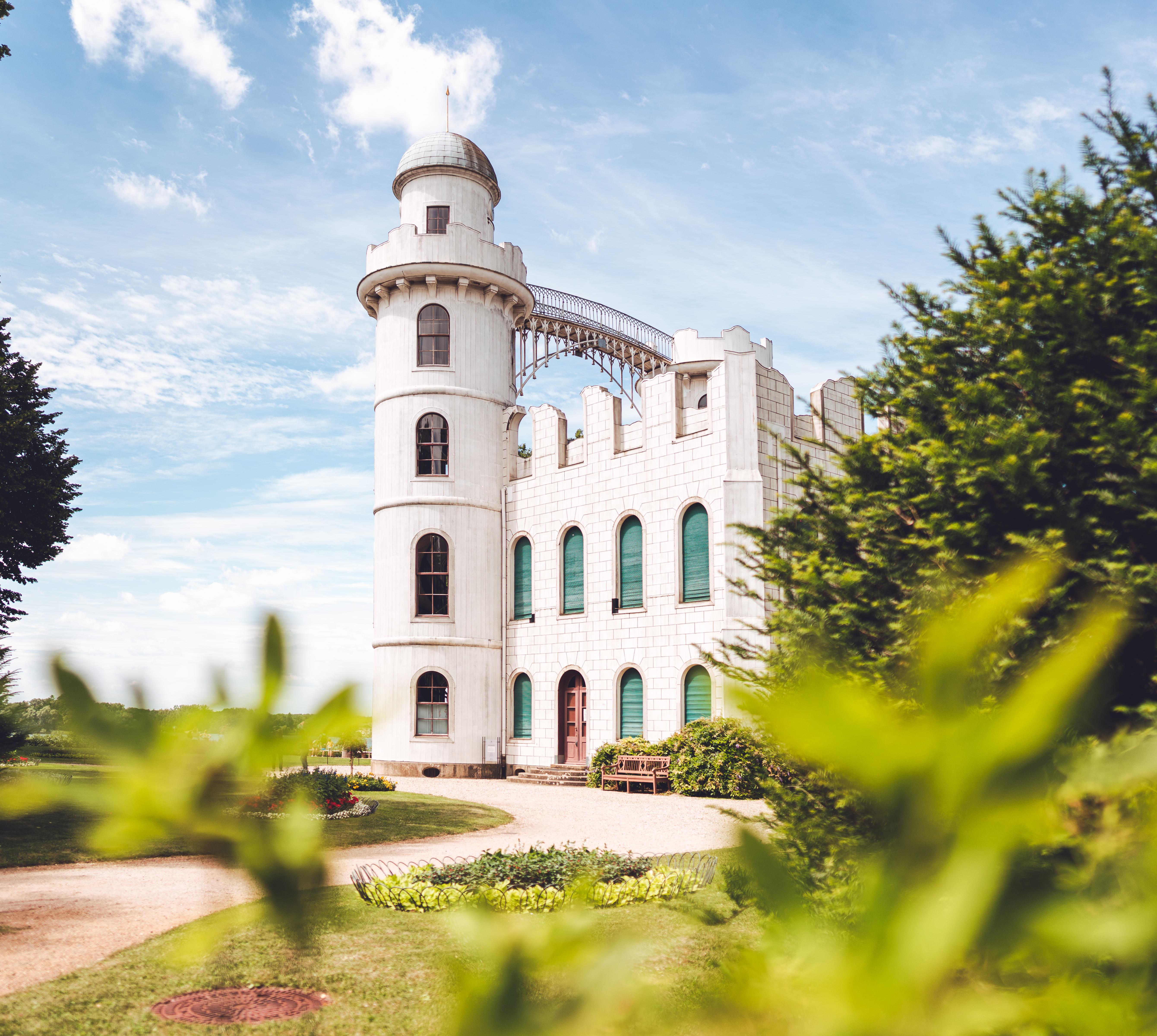 Der Liebschaft Friedrich Wilhelms II. mit der Gräfin Lichtenau haben wir das zweitürmige Lustschlösschen von 1795 zu verdanken. Schneeweiß steht es als künstliche Ruine da, mancher glaubte schon, eine Filmkulisse vor sich zu haben. Die Brücke zwischen den Türmen entstand 1807 als frühes Erzeugnis der berühmten Berliner Eisengießerei.
